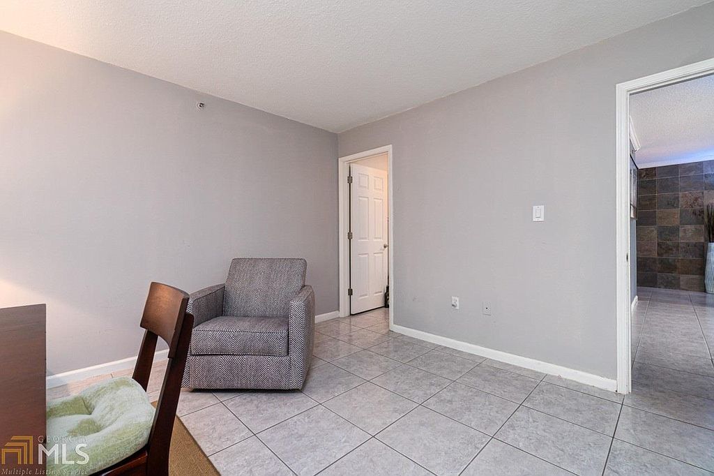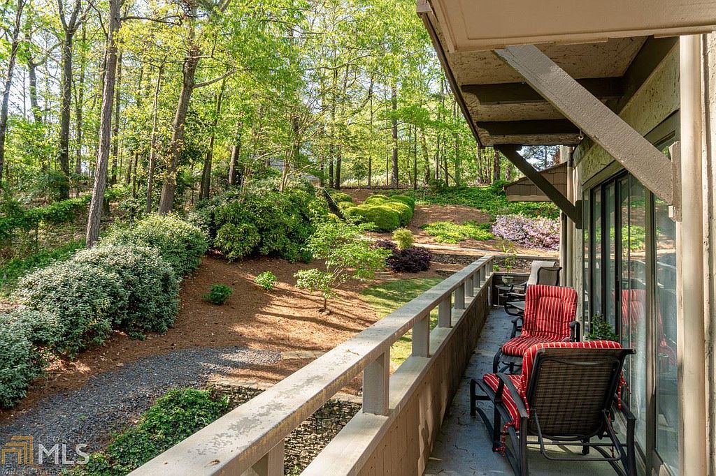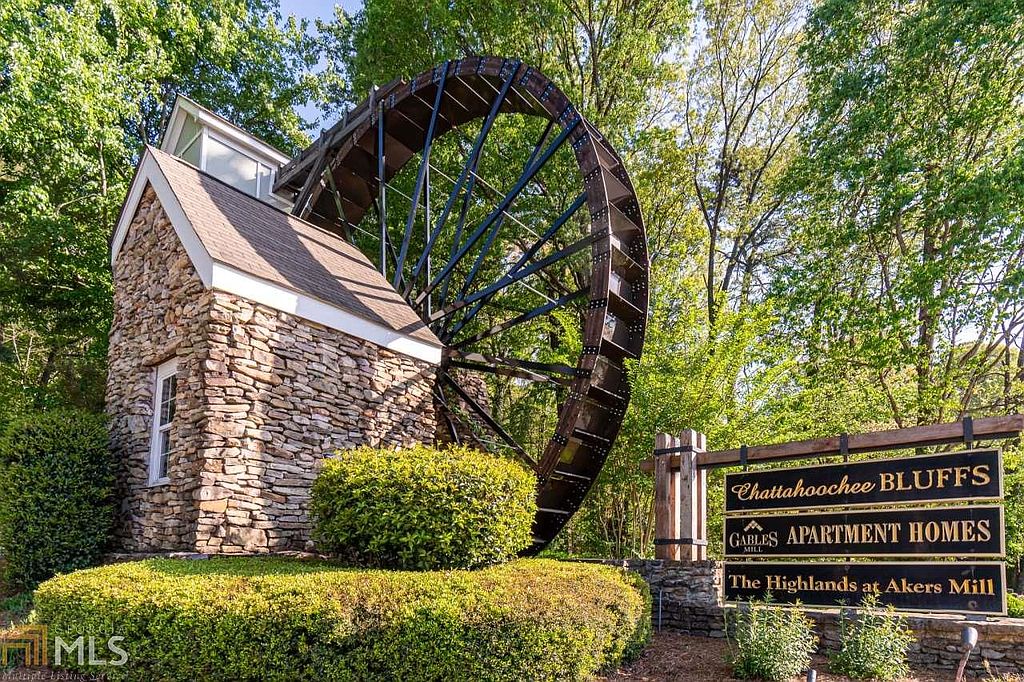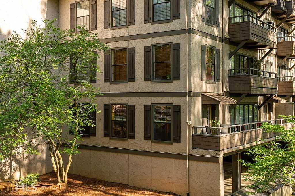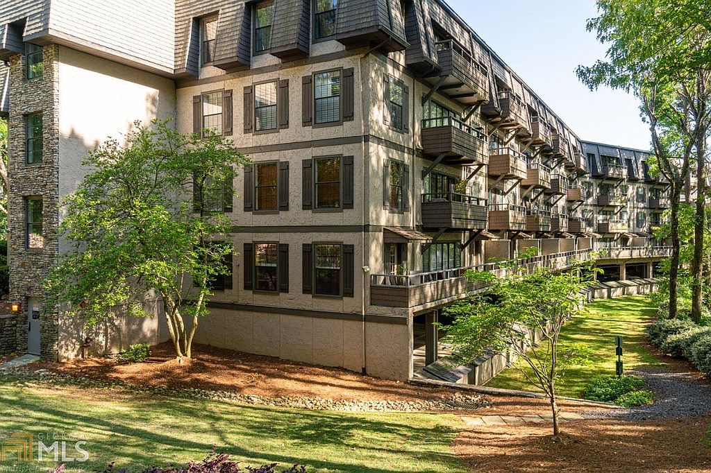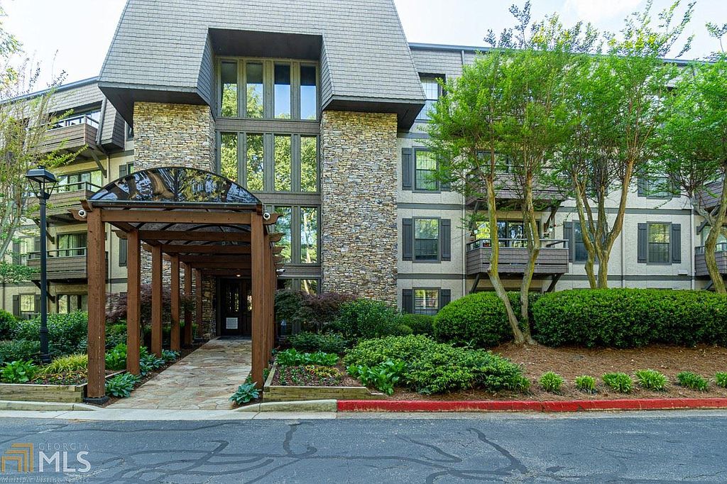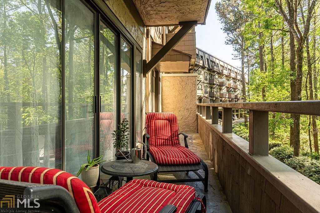 North Atlanta condo in a prime location! Located just inside the perimeter yet walking distance to Truist Park & Chattahoochee Nature Trails! This jewel of a find CORNER condo is on the first floor but is not ground level. Open the front door of the condo to an airy living space. Every living space has a view of nature! Large scale, easy to clean tile floors run throughout the entire unit. Slate accent walls add color & texture. The entertainment system, with a 75' flat screen & soundbar will remain with the unit. The newly renovated eat-in gourmet kitchen has a generous granite breakfast bar, SS appliances, pantry with glass door & a restaurant styled pull down faucet. The master suite is large enough for a sitting area. Master bath features 2 oversized apron sinks with waterfall faucets, jacuzzi tub & walk-in closet with built-ins. The second bedroom has a large full bath that features a SS bowl sink & laundry area & storage cabinets. The balcony is 42'x 4', the largest in the complex! All the living spaces have glass access to the balcony. Sliding glass doors can be opened for indoor/outdoor entertaining. You can literally walk out the door, down the stairs & out the back door into the landscaped greenspace & be on a nature trail in less than 5 min. The condo comes with 2 parking spaces with storage. Come get this jewel before its gone!