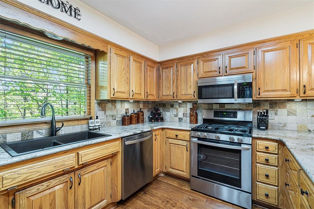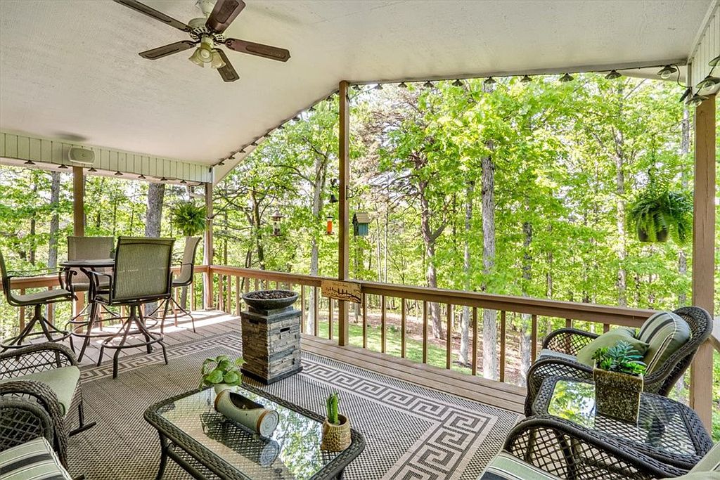 Bella Vista Gem! Private setting, 3 lots at the end of the cul de sac with a winter lake view! The Back 40 mountain bike/walking trail runs through the common ground between the house and Lake Rayburn. Beautifully maintained 2437 square foot 3 bedroom, 2 bath home with oversized 3-car garage with storm shelter on 3 lots. Lots of beautiful oak woodwork and cabinetry, all stainless steel kitchen appliances, 2 living spaces, heated & cooled workshop on lower level, gas-log stove in family room can take the morning chill off both levels! Large master suite with a door leading to the back deck. Tons of storage throughout, upper level covered deck and lower level covered patio. Lots of wildlife and birds to enhance your view. Easy access to shopping and recreation, so much to do in beautiful Bella Vista!