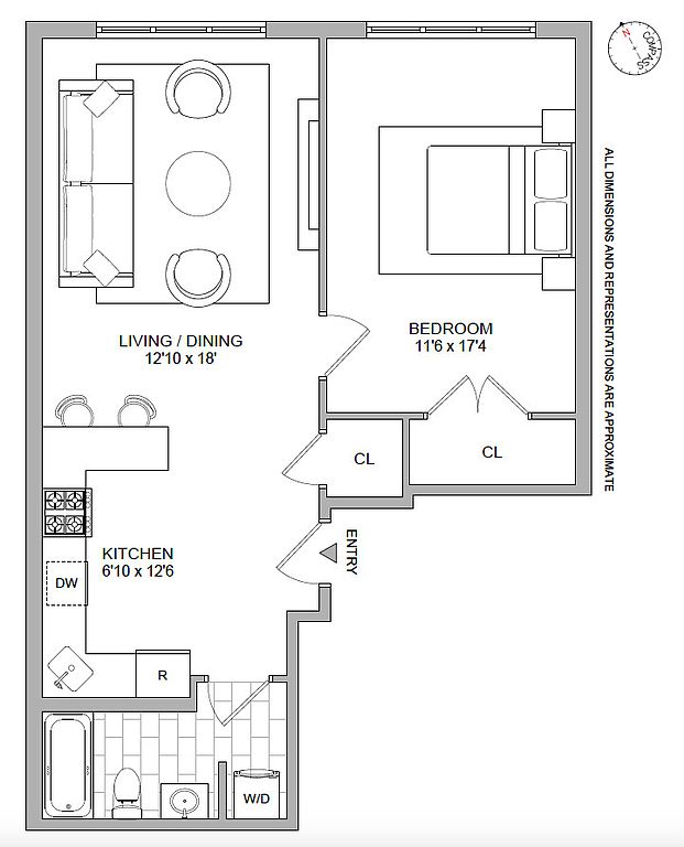 Welcome to Elm Condominium, a boutique building located in the heart of Astoria.\nResidence 2F is a large, 696 sq ft one-bedroom with an open layout concept. Kitchen offers recently updated appliances with beautiful granite countertops. Living room is large enough for a dining area and great for entertainment. King-size bedroom has plentiful storage space and overlooks a beautiful tree-line street. Spa inspired bathroom has a vented washer and dryer.\n\nApartment comes with private storage in the basement. Residents get to enjoy a beautiful communal backyard and landscaped rooftop deck.