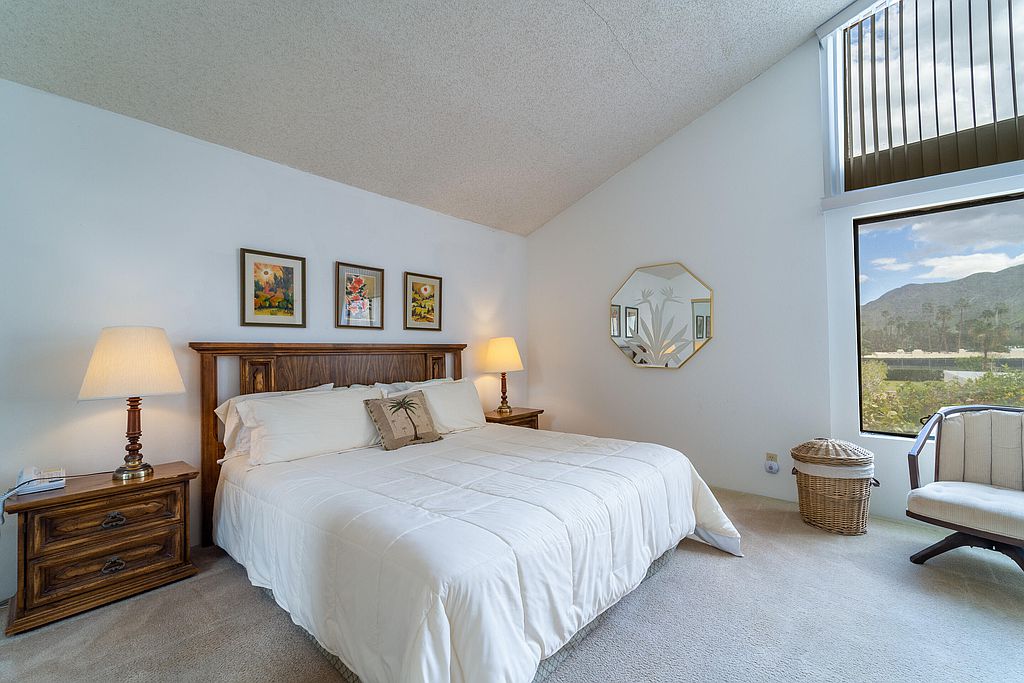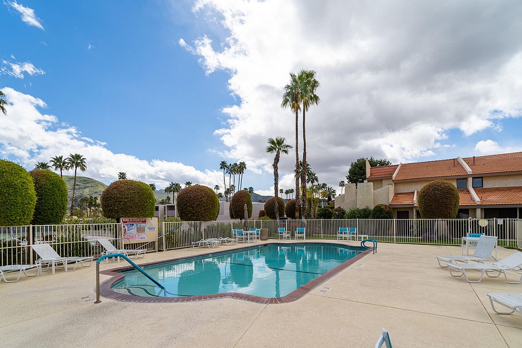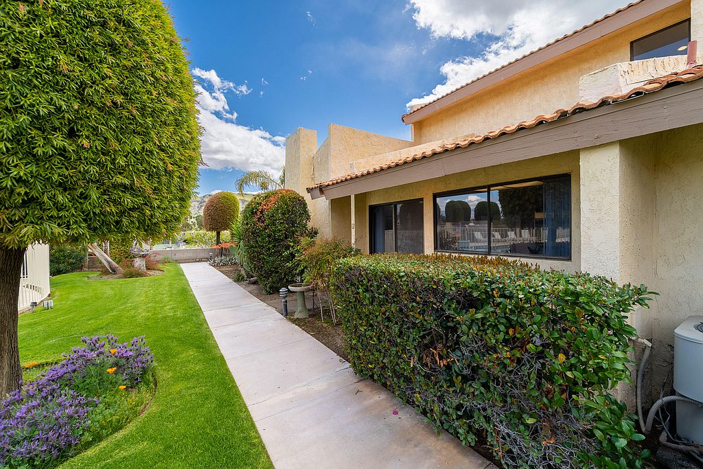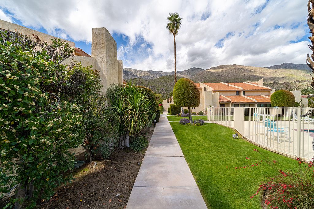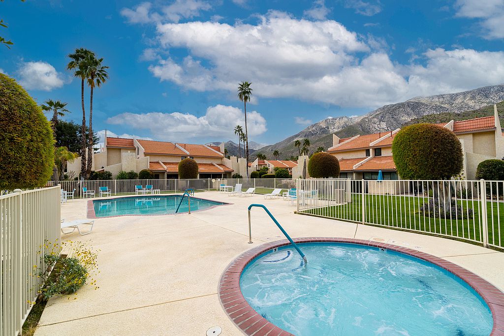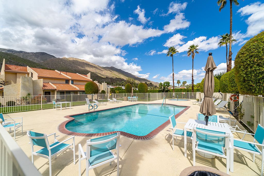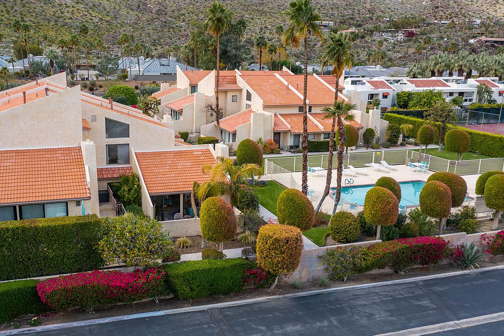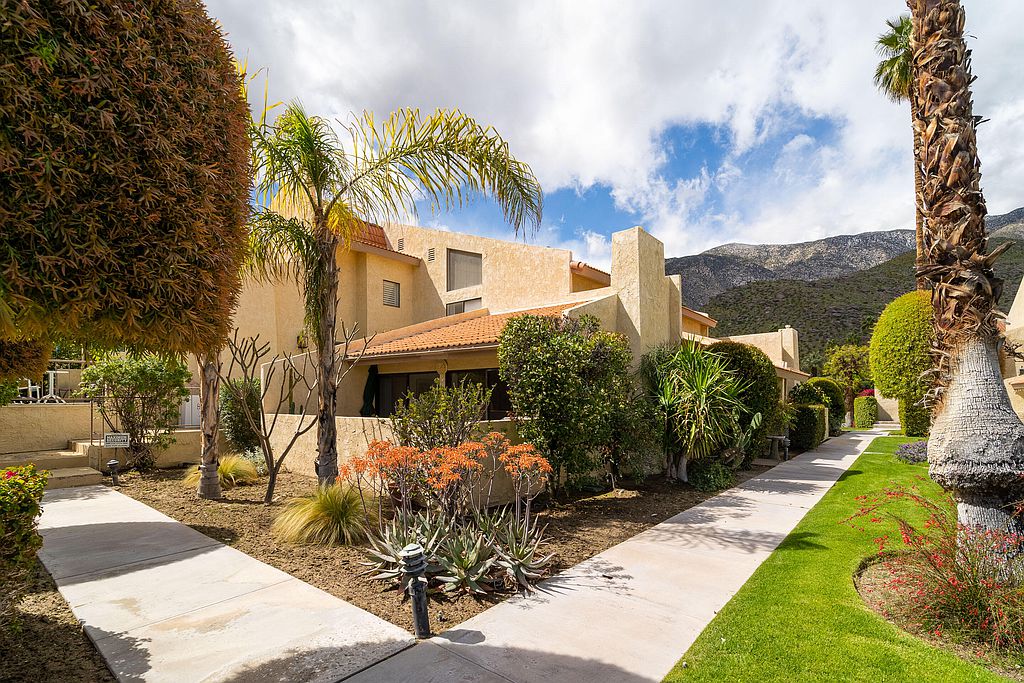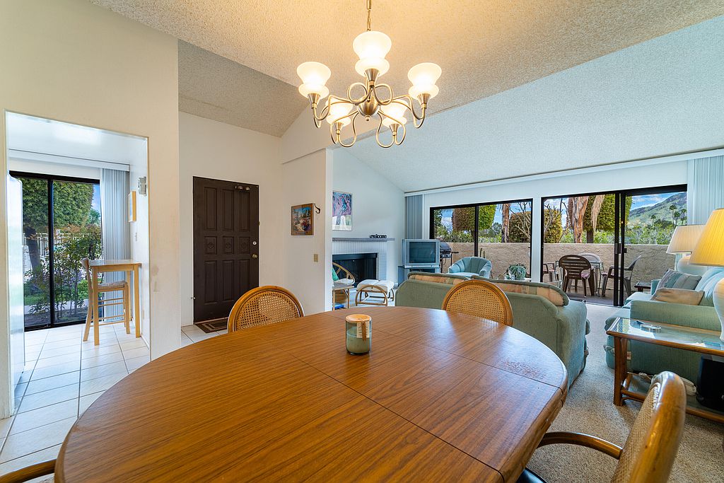 This beautiful, split-level condo is a rare gem in the heart of South Palm Springs. 49 years ago, the owner/seller chose Unit 12 as the community was being built for its location next to the pool & the views. During the 49 years of ownership, the condo has been used primarily during winter months & has been well loved & maintained. Nestled near the mountains in one of the most desirable areas of the city, this condo is situated in the pristine community of Canyon Villas. The community is perfect for those seeking a calm lifestyle in close proximity to downtown Palm Springs. The main level is bright & airy, w/ an open floor plan that flows seamlessly from the dining area to the living room. The living room boasts vaulted ceilings & a gas fireplace, providing a warm & inviting atmosphere, perfect for lounging & relaxing. The sliding doors in the living room open onto the patio that offers peek-a-boo mountain views to the west, making it the perfect spot to entertain guests. The kitchen offers tile flooring, Formica countertops, & beautiful north-facing pool & mountain views. The lower level of the condo features a convenient laundry area, ample storage, & a 2-car carport. The upper level of the condo is ultra-private and features a spacious master suite with vaulted ceilings, a walk-in closet, & western mountain views. The property is Fee Simple-Land, meaning that you own the land. The HOA covers maintenance of the building, roof, water, trash, cable TV, tennis, pools and spas.