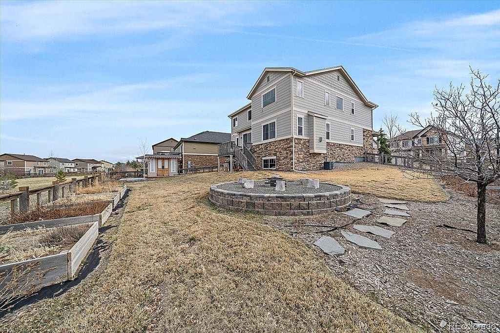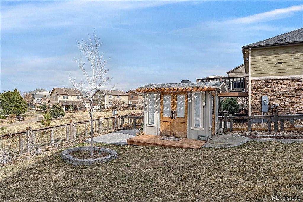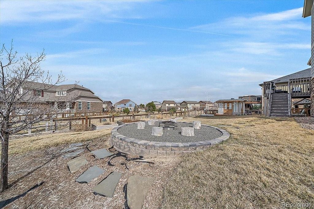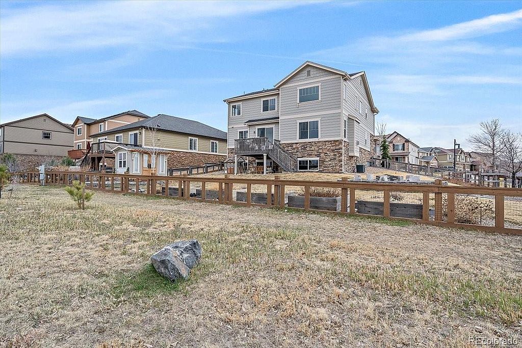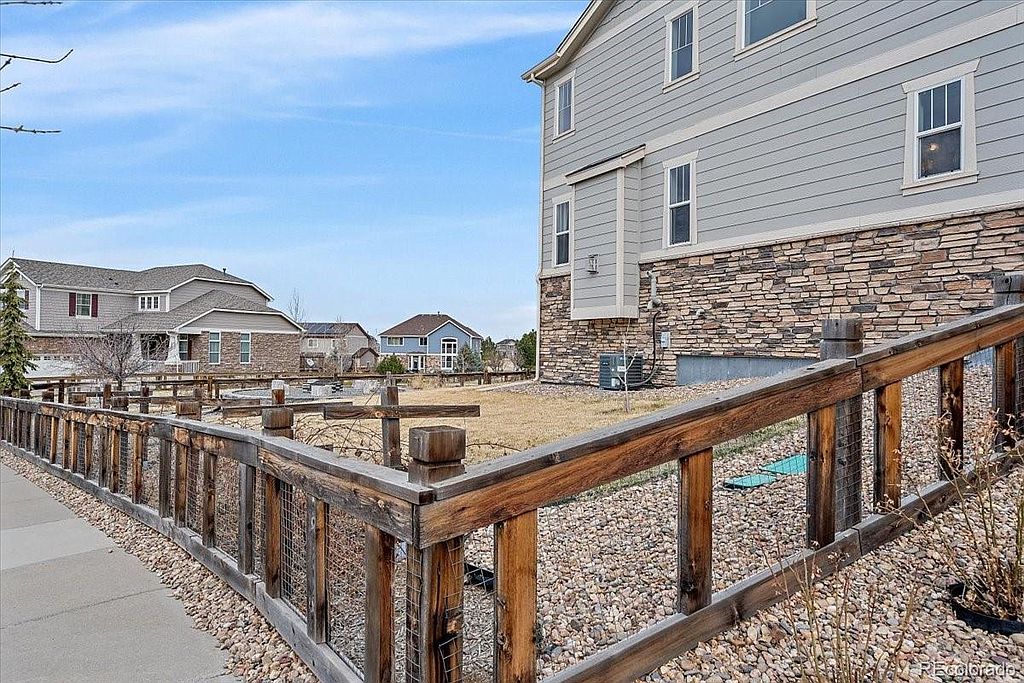 Serenity Ridge beauty located on a cul de sac on a large corner lot, backing to greenbelt. This is the perfect family home with all 4 bedrooms upstairs and a conveniently located laundry room with w/d included. Kitchen boasts granite counter tops, good sized island, pantry, s/s appliances that are all included, desk area perfect for homework that opens up to your family room with huge vaulted ceilings and your gas fireplace. Just off the front door is a flex room that is currently set up as a living room, but could be used as an office or formal dining. The full garden level basement is waiting for your finishes. Just off the kitchen step onto your deck overlooking almost a 1/4 acre lot with designated fire pit, planters ready for your garden, ideal for entertaining. This is a great location in the Cherry Creek School district, close to Southlands Mall, numerous restaurants and easy access to DIA.