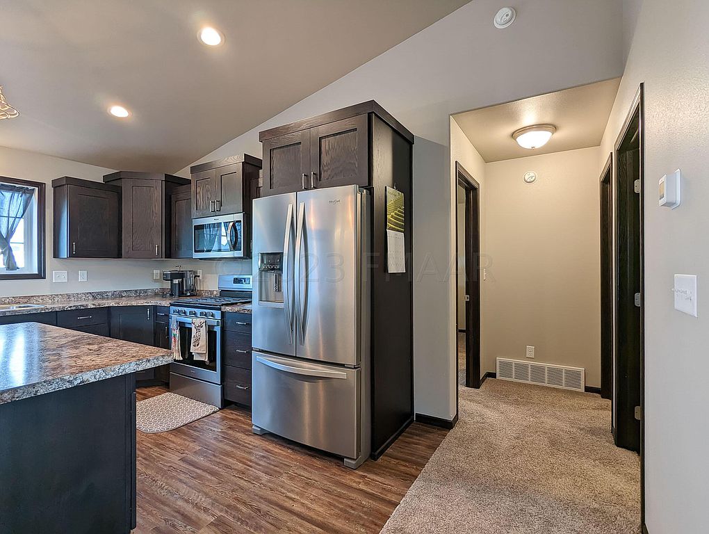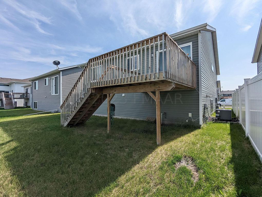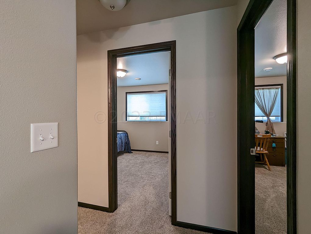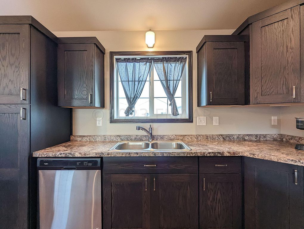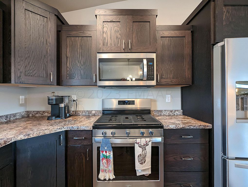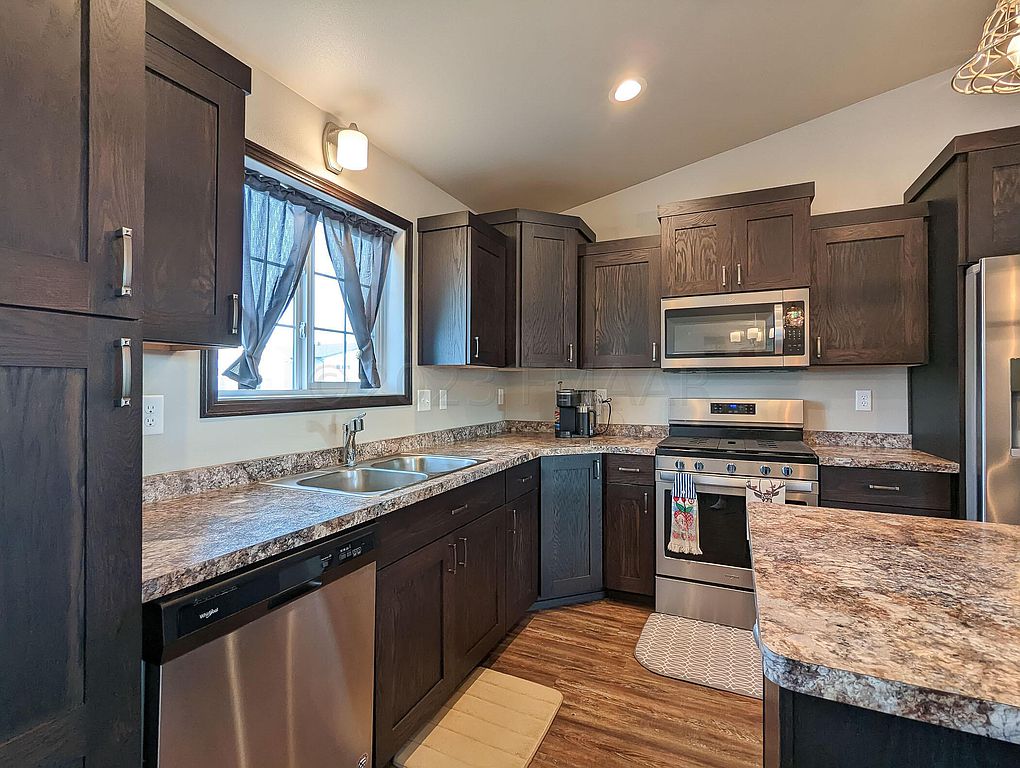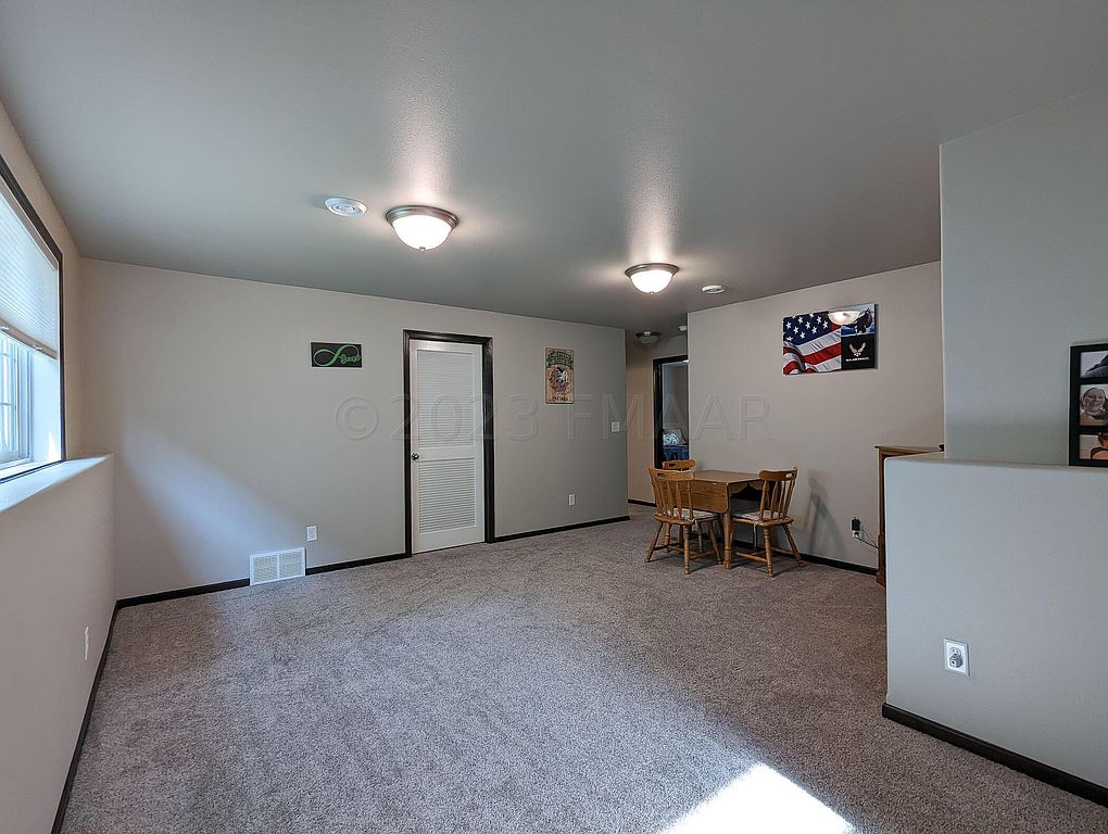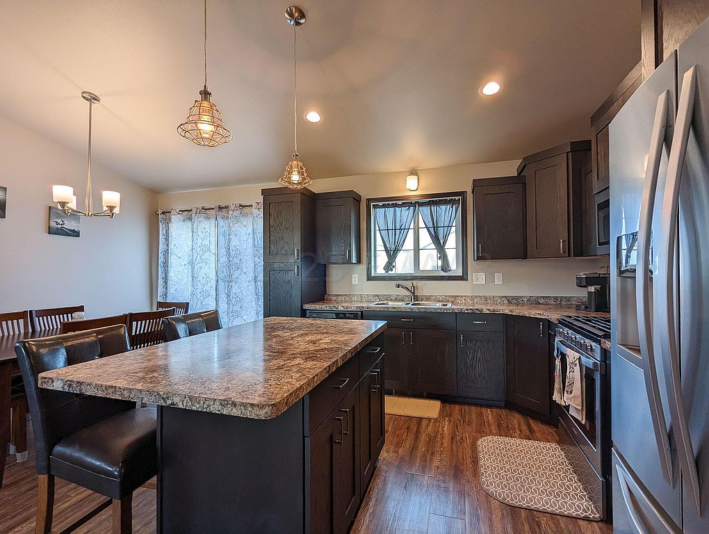Here is an opportunity to own this quality built SINGLE FAMILY home featuring 3 bedrooms, 2 bathrooms, and 2 stall attached garage, located in a desirable neighborhood of Eaglewood Development in West Fargo. The yard is fully done for your entertainment including a deck and sprinklers to keep the yard plush & green. On the upper level you will find an open floor plan featuring a large living room w/updated hard surface flooring, vaulted ceilings, recessed lights, beautifully designed kitchen w/custom cabinets, upgraded stainless steel appliances including GAS RANGE, fancy countertops, island, & pendant lights. Amazing private suite w/large Hollywood bathroom and walk in closet. Upper-level laundry room comes with shelving for storage and washer/dryer included. Lower level has a huge family room, 2 bedrooms, a bathroom, and storage space. Garage is also finished for your convenience along with a service door. Home has many appealing features including battery backup sump pump, sprinklers, horizontal blinds, magnetic storm windows and much more. Make this your home today!