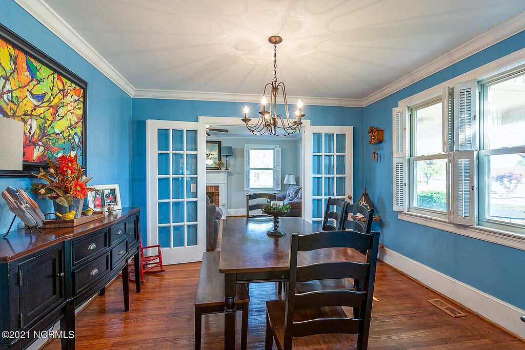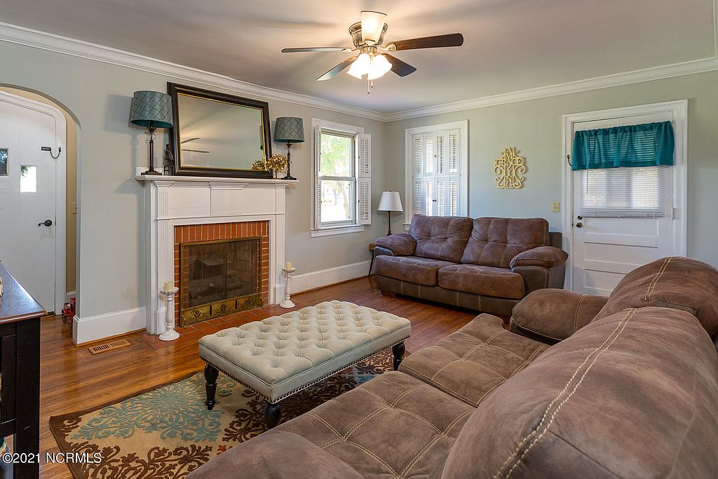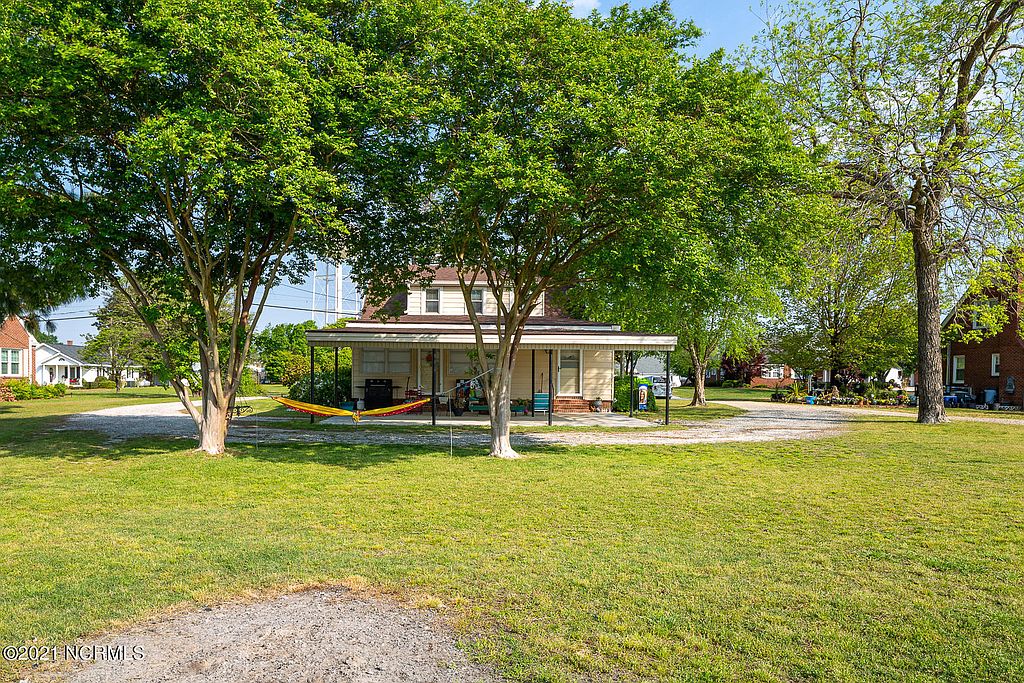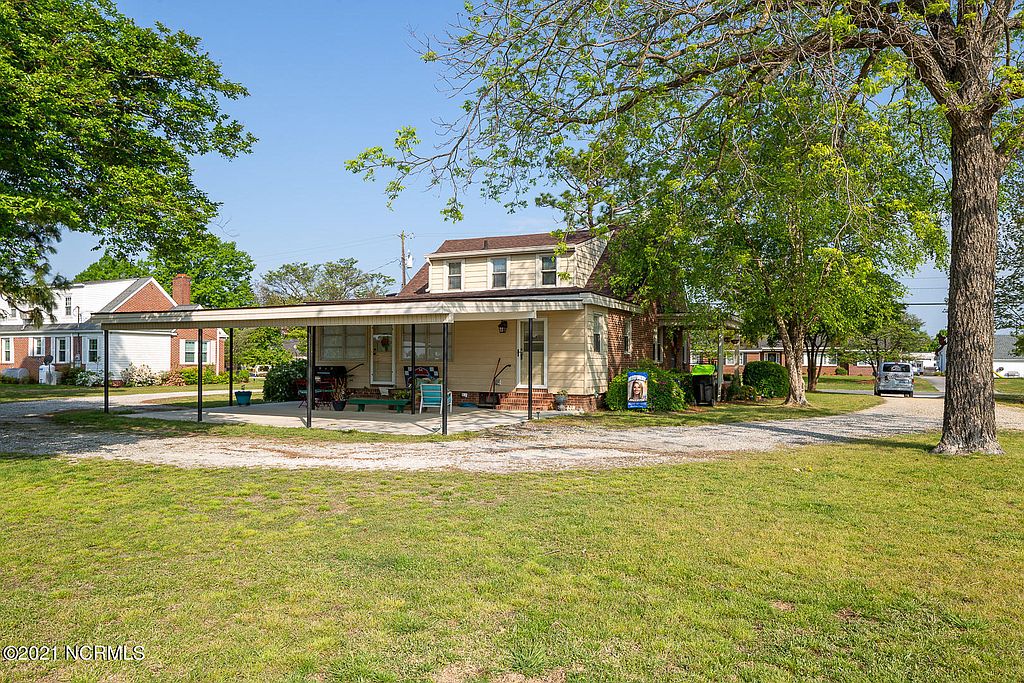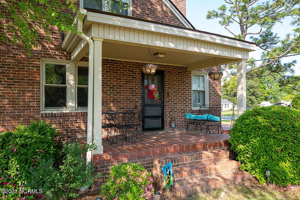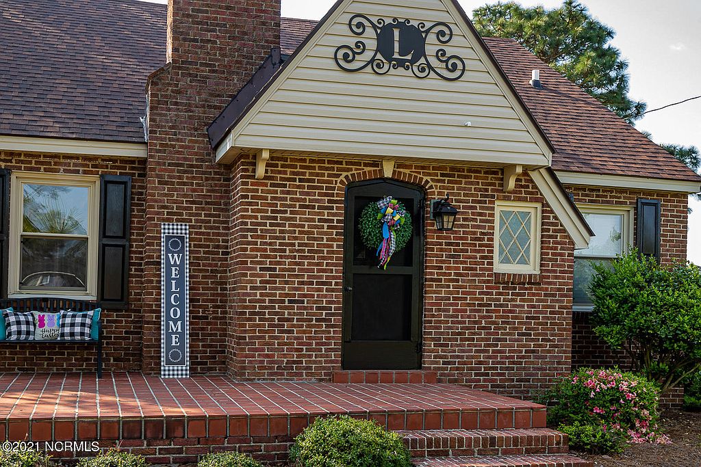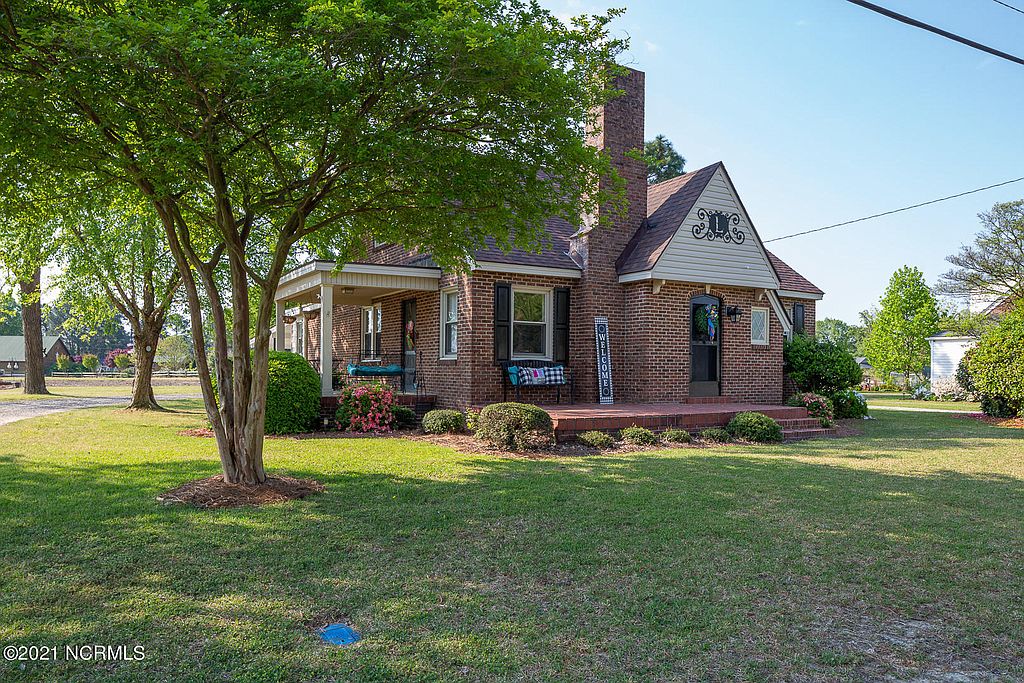 Beautiful bungalow nestled under the pines in quaint Newton Grove! Built in 1947 this brick home offers loads of charm and character. Oversized front porch welcomes you into rounded door way, wide moulding and gleaming wood floors. Family room with detailed fireplace mantle,. Opens on covered side porch. Double french doors open to formal dining room. Great storage in kitchen with new flooring. First floor laundry/mud room with utility sink. Den on back idea for entertaining. Currently used as office/workspace. 2 bedrooms on first floor and tiled bath. Second floor with wood floors, 2 bedrooms and full tiled bath. Covered carport with cement pad. Detached storage shed. Vinyl replacement windows. Updated paint throughout. Wood shutters. Great location within walking distance to Library, Town Hall, restaurants and shopping. Ideal location for easy commutes and access to I40 and more.