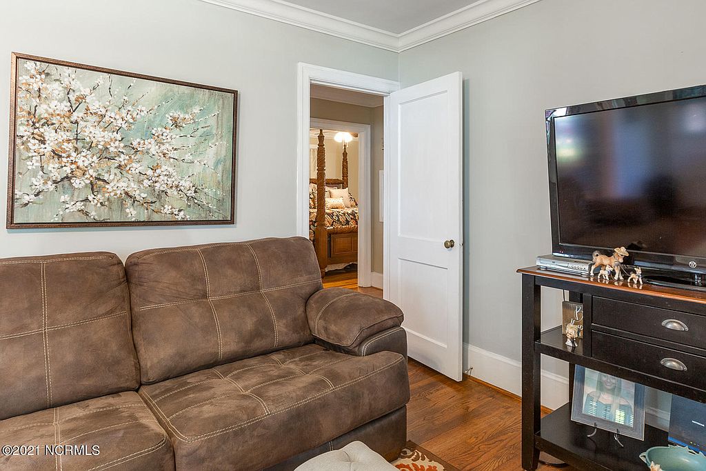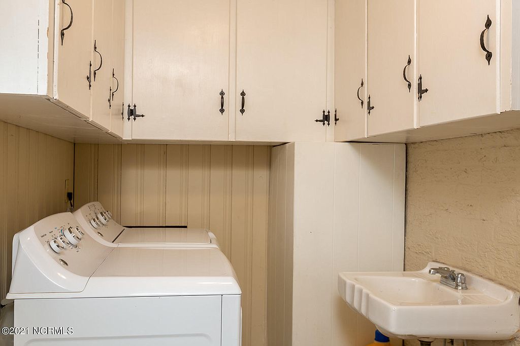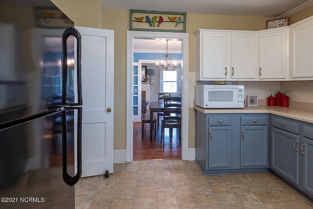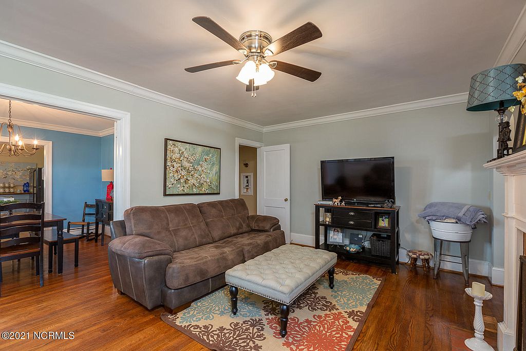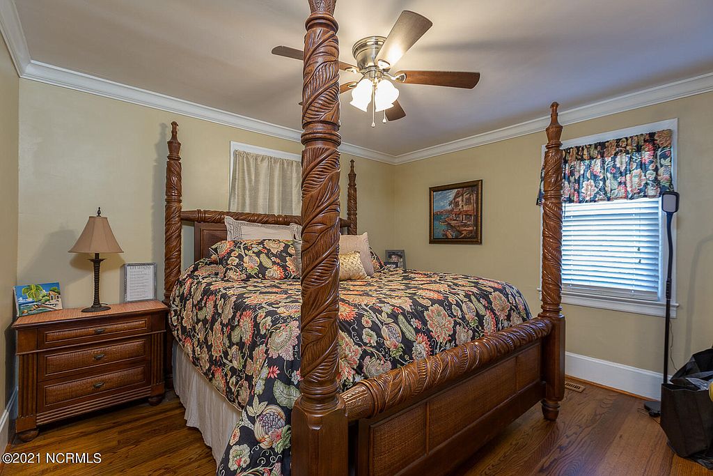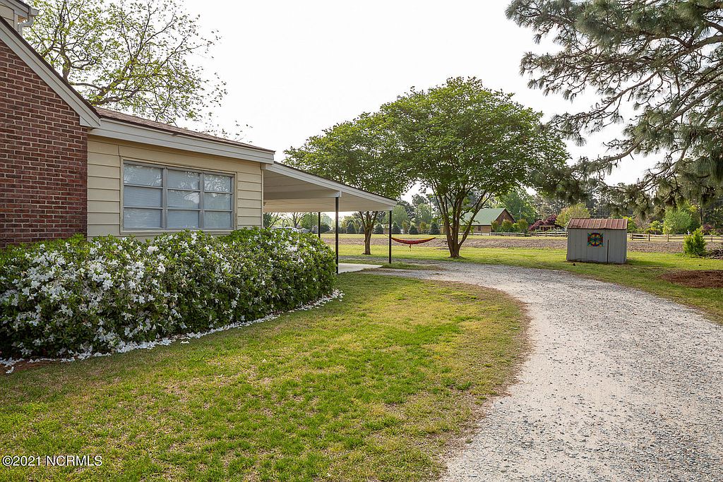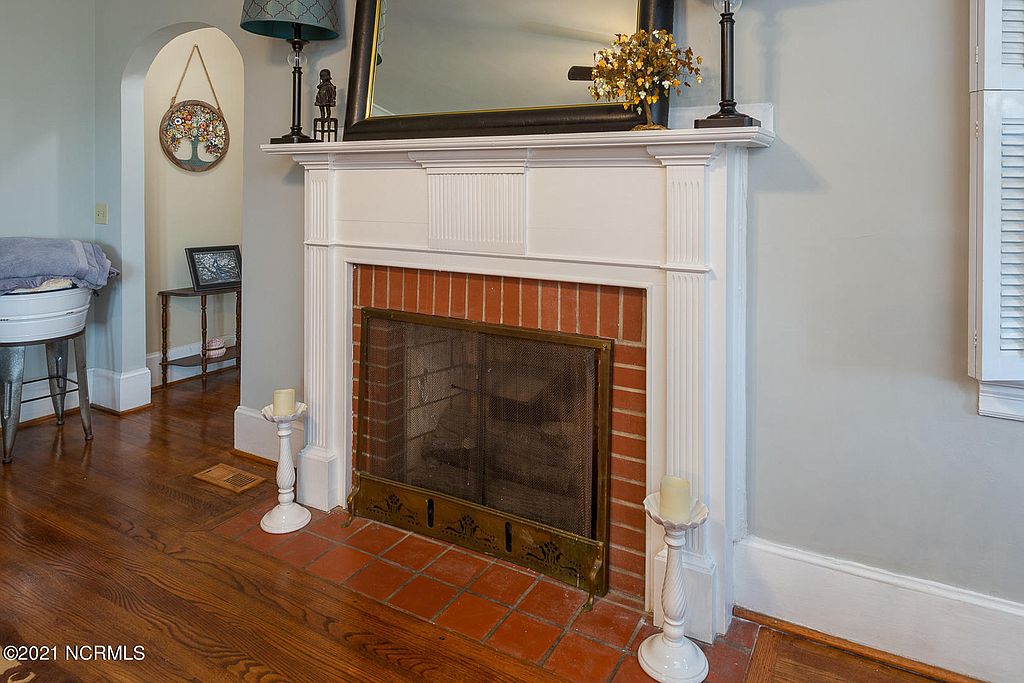 Beautiful bungalow nestled under the pines in quaint Newton Grove! Built in 1947 this brick home offers loads of charm and character. Oversized front porch welcomes you into rounded door way, wide moulding and gleaming wood floors. Family room with detailed fireplace mantle,. Opens on covered side porch. Double french doors open to formal dining room. Great storage in kitchen with new flooring. First floor laundry/mud room with utility sink. Den on back idea for entertaining. Currently used as office/workspace. 2 bedrooms on first floor and tiled bath. Second floor with wood floors, 2 bedrooms and full tiled bath. Covered carport with cement pad. Detached storage shed. Vinyl replacement windows. Updated paint throughout. Wood shutters. Great location within walking distance to Library, Town Hall, restaurants and shopping. Ideal location for easy commutes and access to I40 and more.