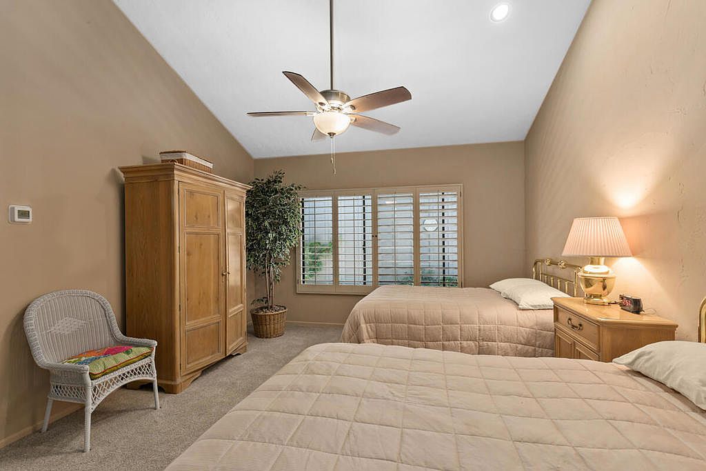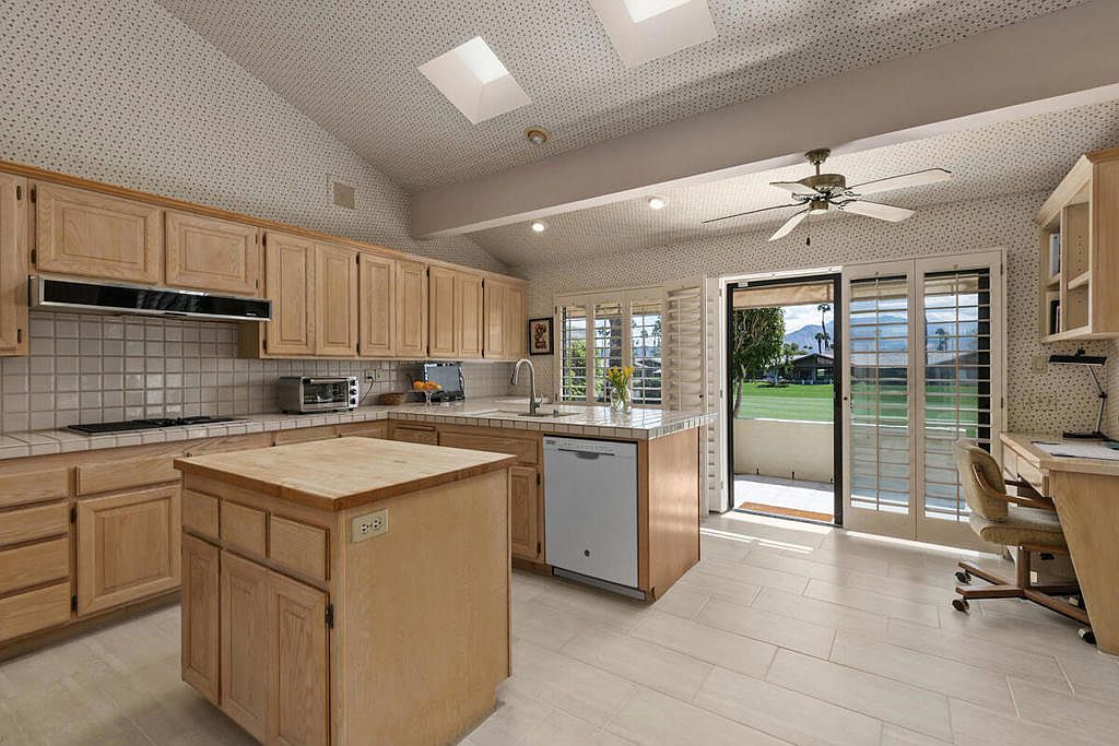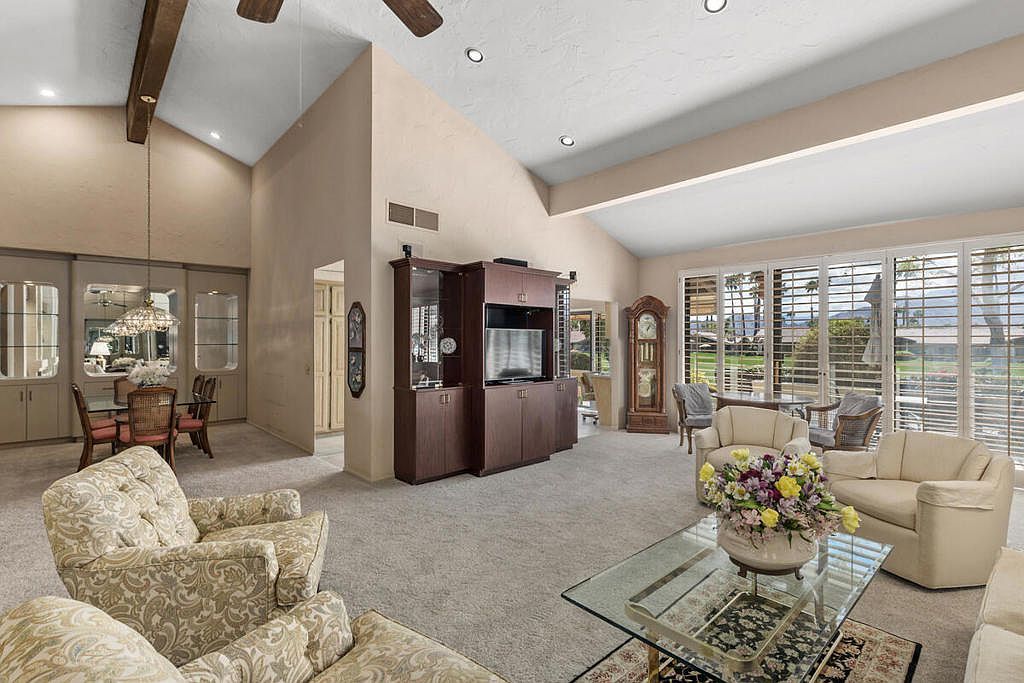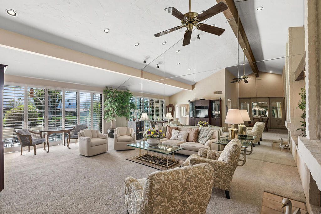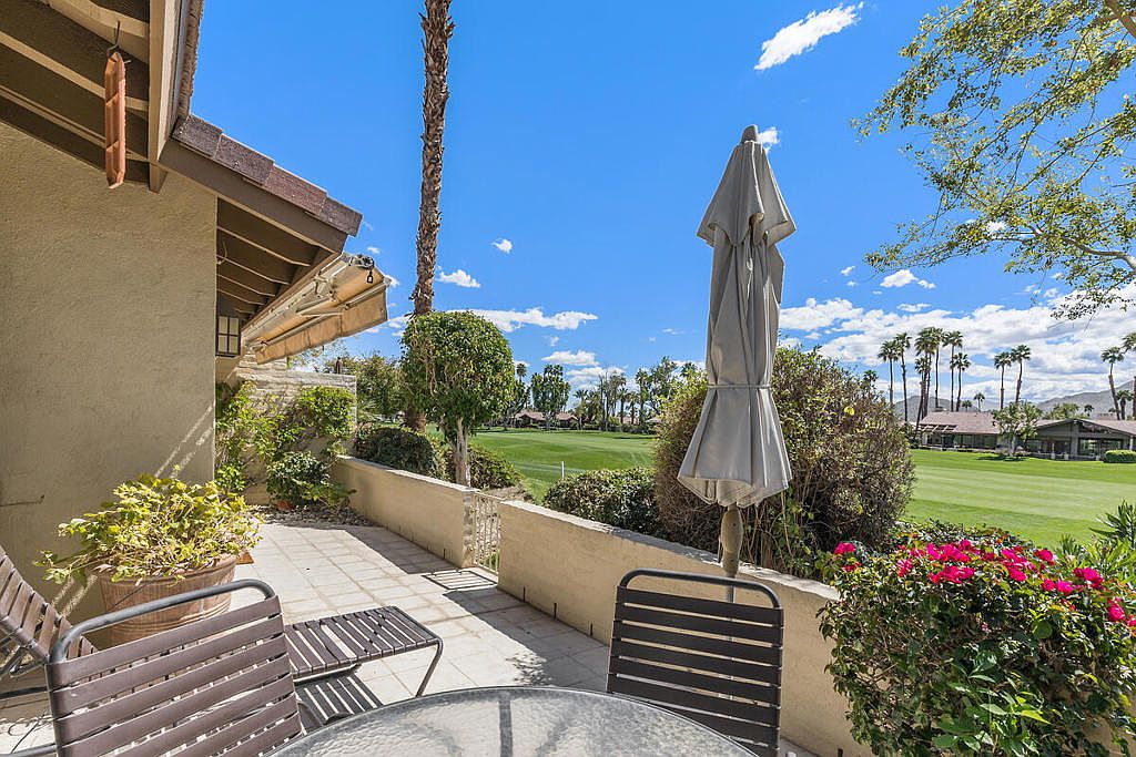 Welcome to The Lakes Country Club where this expanded Laramie plan is located on one of the most private streets in the community. The South-facing patio, with retractable awning, is situated on a double fairway with unobstructed views of the Santa Rosa mountains. This 2,216 sq ft home offers 2 bedrooms, 3 1/2 bathrooms and a home office with enclosed atrium. The expanded great room and kitchen is light and bright, offering plenty of space for entertaining and enjoyment. Recent updates include two new A/C units, tankless water heater, garage door opener, porcelain tile flooring in entry, kitchen and bathrooms and new carpet in other living areas. This home is ready for your own personal touch and style. The Lakes Country Club is centrally located in Palm Desert, CA and offers a robust schedule of social and fitness activities at the new Clubhouse and sensational Health & Wellness Center. Enjoy Tennis, Pickleball or Pop Tennis, Bocce or any of the 44 community pools and spas. For Golfers, the Club offers membership options for the 27 hole championship golf course designed by Ted Robinson. Included furnishings per inventory list. Professional photos available March 25, 2023. First showings, by appointment, to start March 24, 2023.