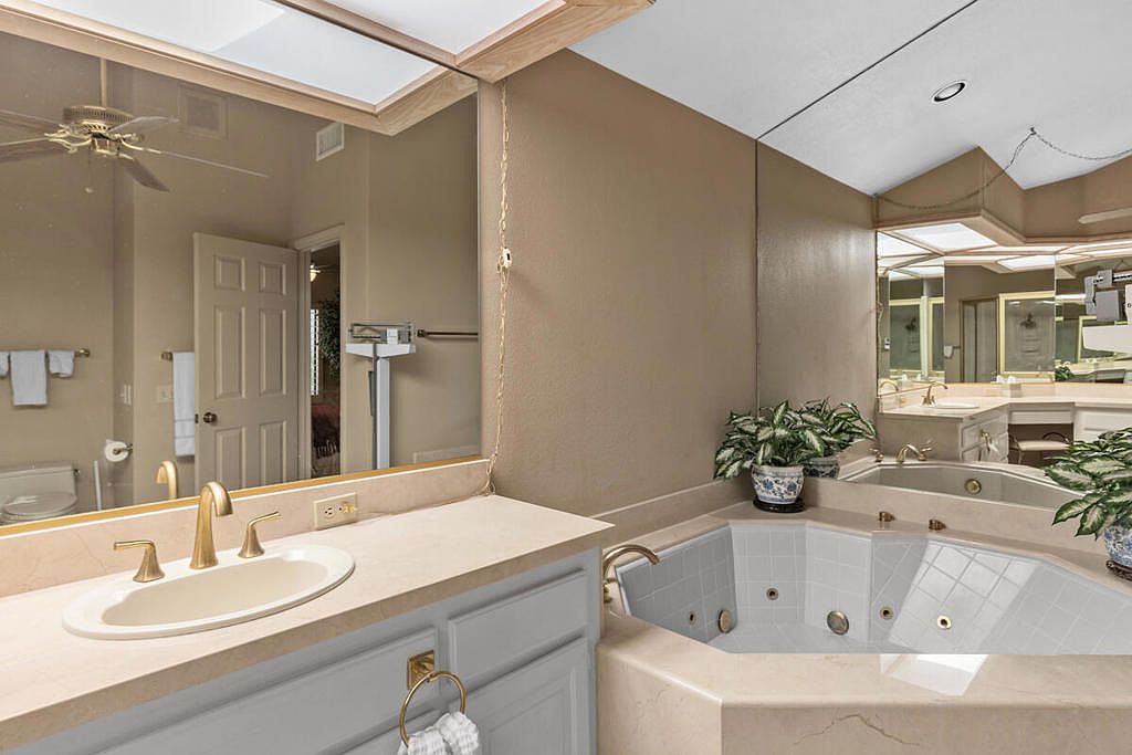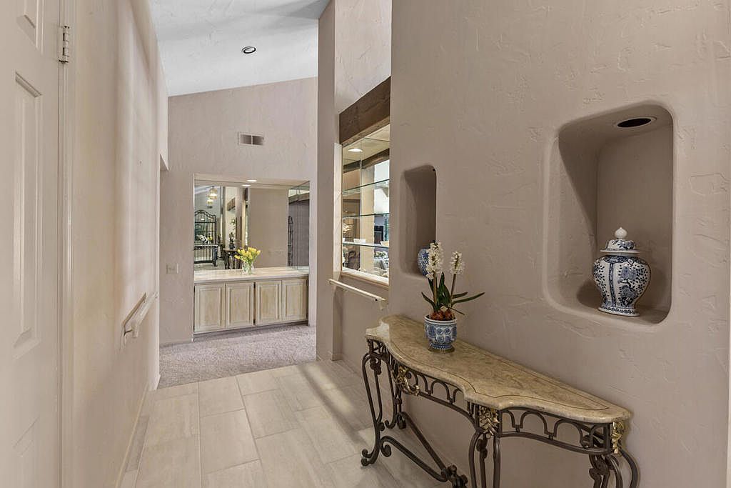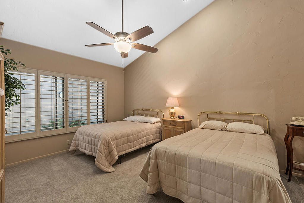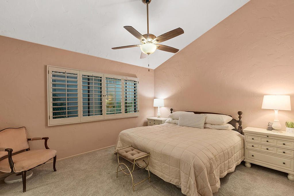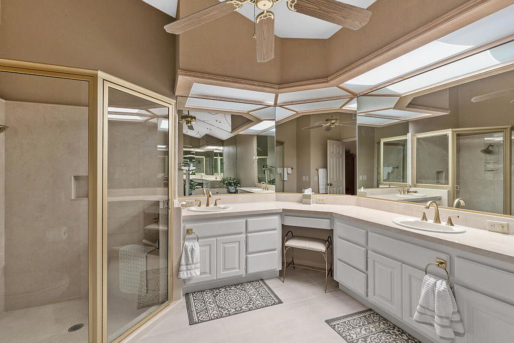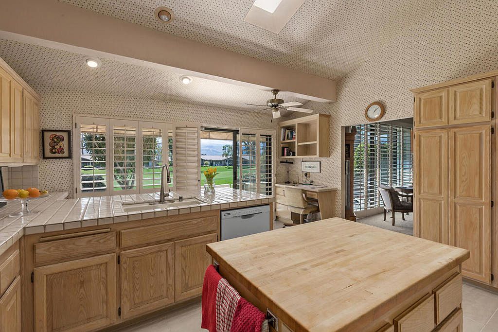 Welcome to The Lakes Country Club where this expanded Laramie plan is located on one of the most private streets in the community. The South-facing patio, with retractable awning, is situated on a double fairway with unobstructed views of the Santa Rosa mountains. This 2,216 sq ft home offers 2 bedrooms, 3 1/2 bathrooms and a home office with enclosed atrium. The expanded great room and kitchen is light and bright, offering plenty of space for entertaining and enjoyment. Recent updates include two new A/C units, tankless water heater, garage door opener, porcelain tile flooring in entry, kitchen and bathrooms and new carpet in other living areas. This home is ready for your own personal touch and style. The Lakes Country Club is centrally located in Palm Desert, CA and offers a robust schedule of social and fitness activities at the new Clubhouse and sensational Health & Wellness Center. Enjoy Tennis, Pickleball or Pop Tennis, Bocce or any of the 44 community pools and spas. For Golfers, the Club offers membership options for the 27 hole championship golf course designed by Ted Robinson. Included furnishings per inventory list. Professional photos available March 25, 2023. First showings, by appointment, to start March 24, 2023.