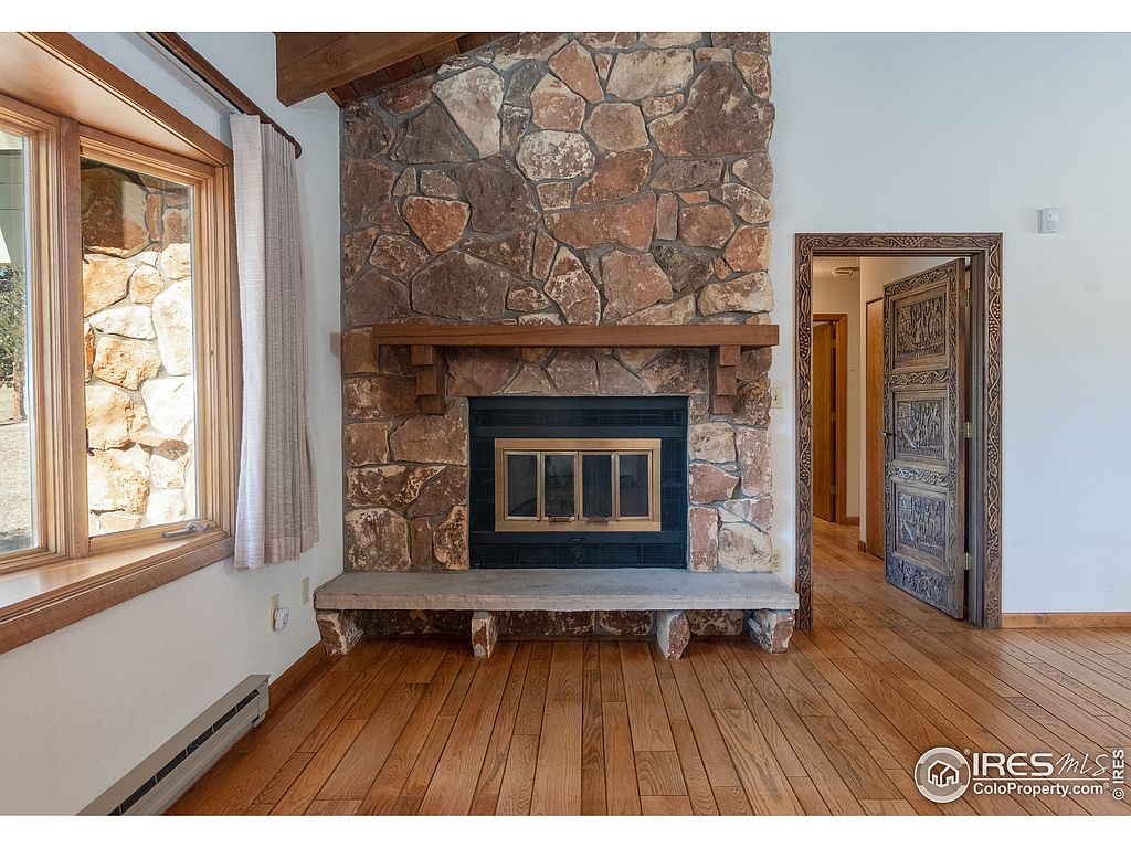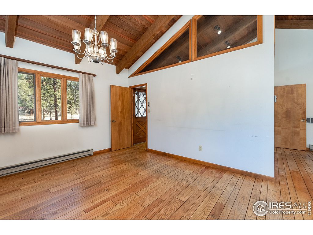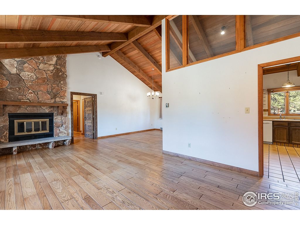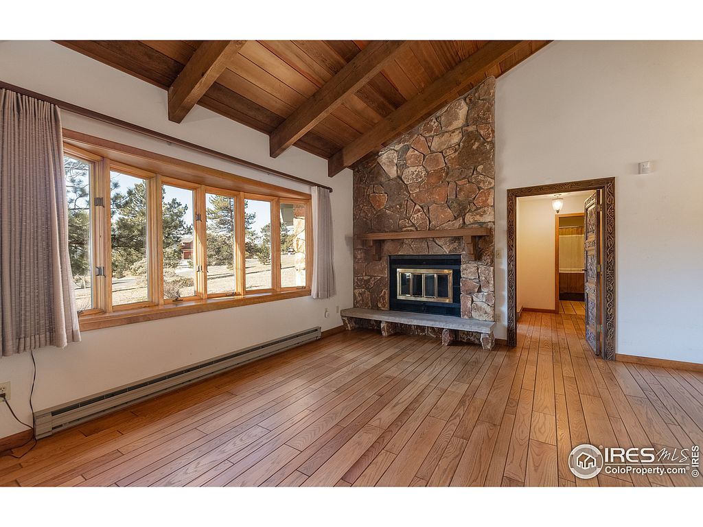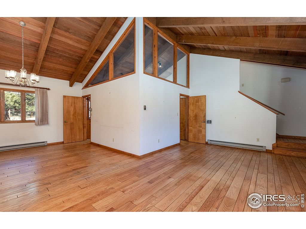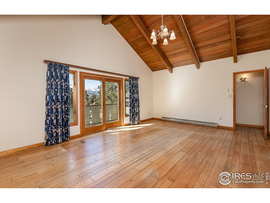 Rare opportunity to live on Prospector Lane in beautiful Estes Park, CO! Stunning setting on 1 acre with amazing views of the Continental Divide! Main level offers 3 bedrooms with wood floors and 1 full bath. Great room and dining room have vaulted wood beamed ceilings, wood floors, floor to ceiling moss rock fireplace and bay window to frame the mountain views. Large primary suite offers privacy on its own upper level with balcony that looks directly at Longs Peak & Mt Meeker. Full primary bath is set up with sink, toilet & closet on either side of the tub/shower room. Attached 2 car garage & impressive stone entry. One of the best locations in Estes!