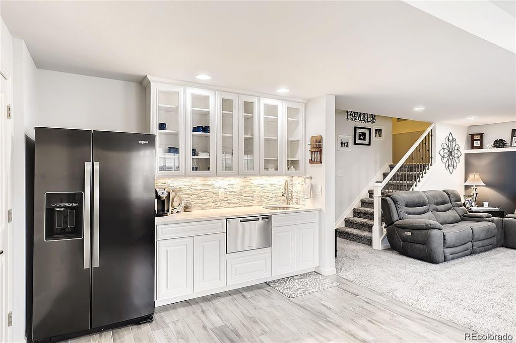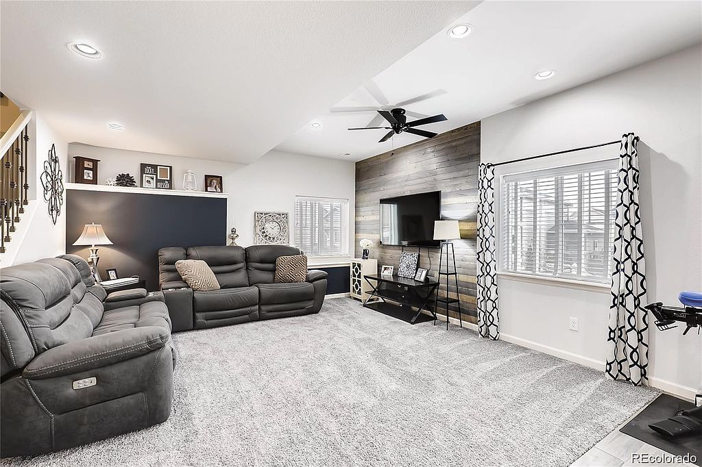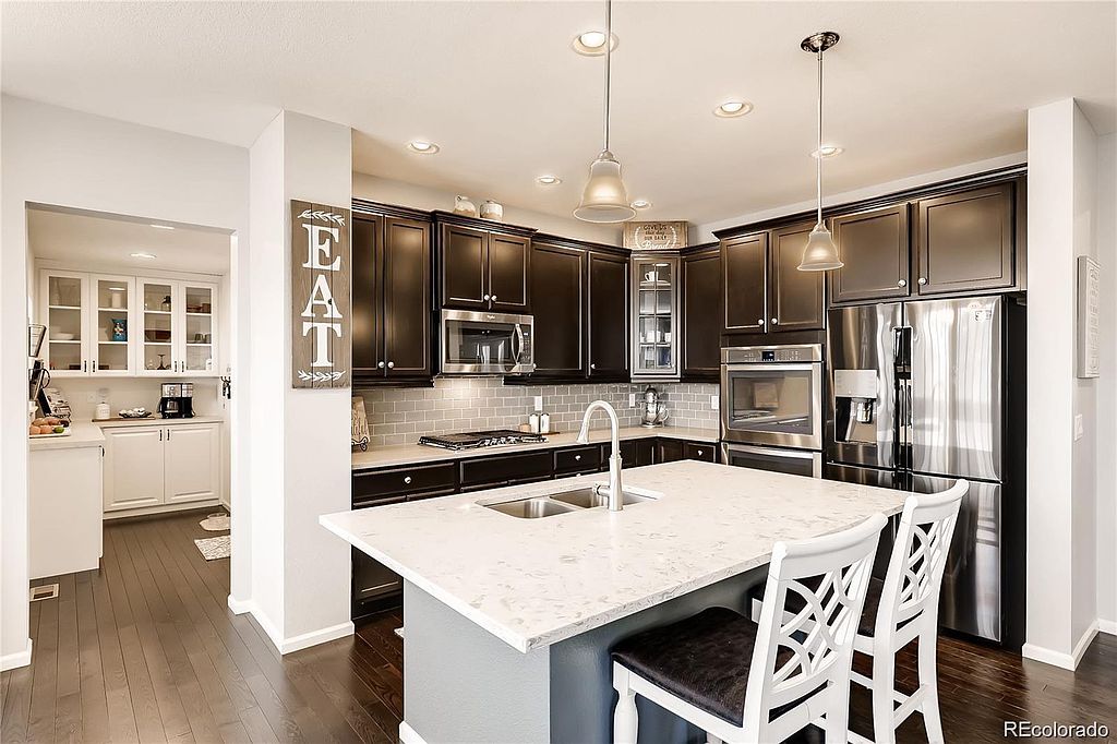 Gorgeous planned community with trails, open space, two lakes, and a park setting. Gourmet kitchen with double ovens, granite countertops, walk-in pantry with custom pantry organizers, and spacious butler's pantry. The formal dining area leads to a covered deck with amazing mountain and lake views. Main floor is also host to a lovely home office/den area that is front facing and looks out to the meticulously kept front yard. Primary suite with over-sized shower and custom closet organizers for plenty of storage. Beautifully finished walk-out basement with kitchenette, large bedroom, bathroom, and very spacious entertainment area. Natural light throughout the entire house keeps it light, bright, and inviting. Professional landscaping includes gas fire pit and custom built shed. Lots of extra side walk and concrete work. This home is an organizers dream come true! Call today for a private showing and more details! MORE PHOTOS COMING SOON!