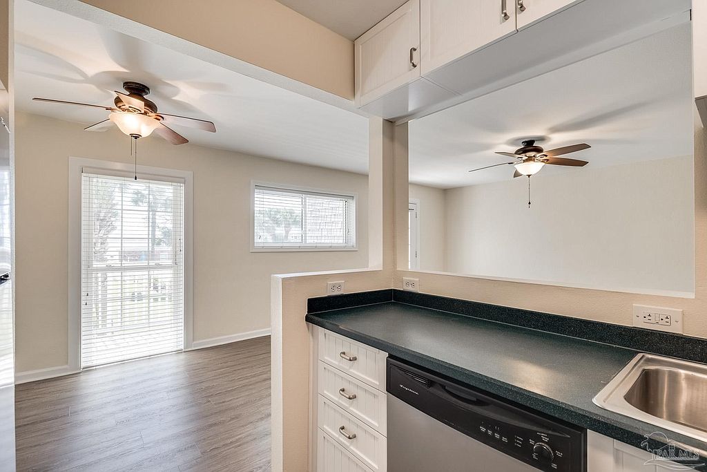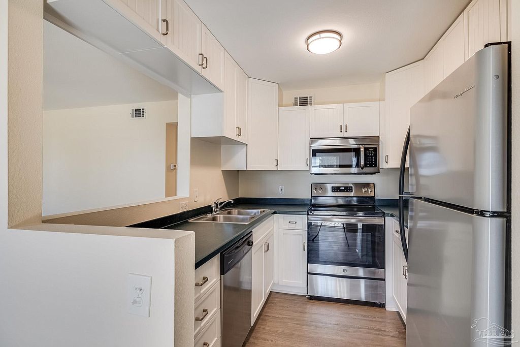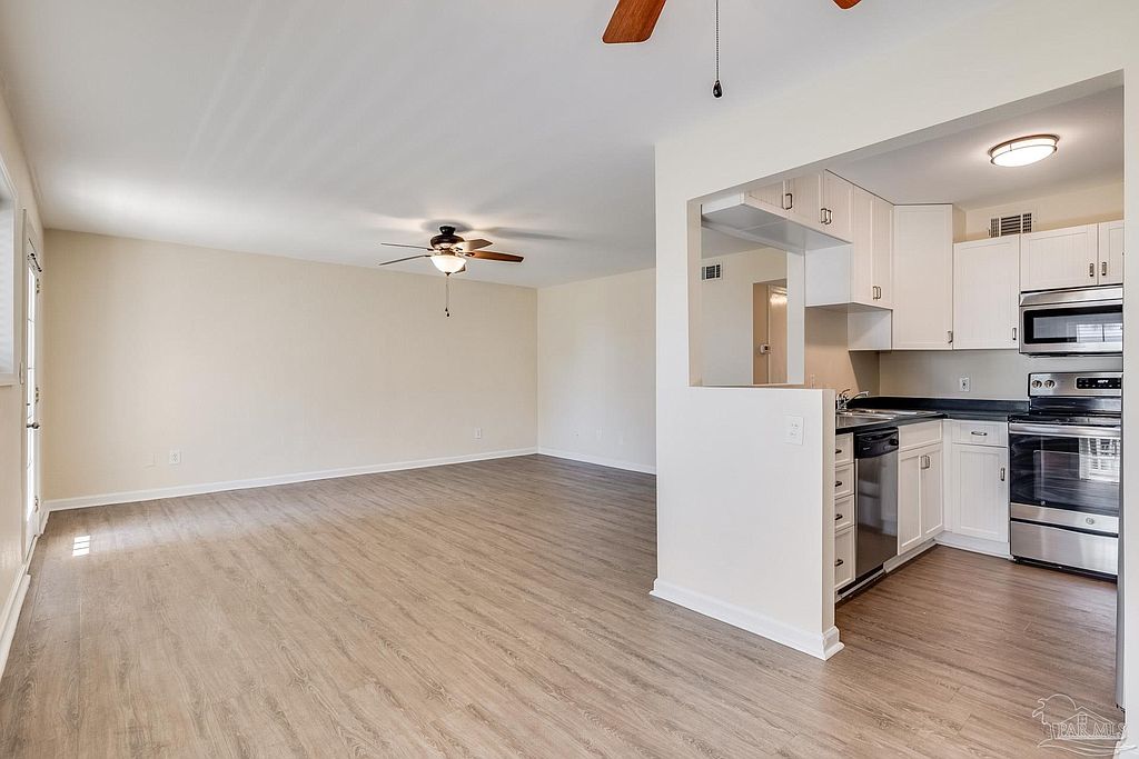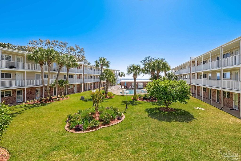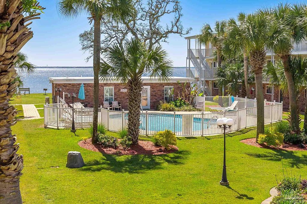 Welcome home to Bayview Terrace! This 2 bedroom, 1 bath condo is located in the beautiful East Pensacola Heights area, within walking distance to restaurants, shopping, and A.K. Suter Elementary School. This unit has been completely refreshed and is ready for you to move right in. Step off the elevator and right through your front door to find a neutral color palette throughout with luxury vinyl plank flooring flowing throughout the main living areas and bedrooms. The large living room opens seamlessly into the dining room and kitchen, making this unit live much larger than its square footage. The kitchen has been upgraded with classic white cabinetry, solid surface countertops, and stainless steel appliances. Down the hall, you'll find the 2 bedrooms, both with ample closet space, and the well-appointed full bath. To top it all off, this unit has interior laundry added in the guest bedroom closet, and a beautiful view of the courtyard and the bay right outside the front door. The complex is well maintained with beautifully manicured grounds, a community swimming pool, a community room/event space, and a beautiful grassy lawn overlooking the bay. This condo truly has it all at such an affordable price tag, so check out the 3D tour and floor plan and schedule your showing today before this one is sold!