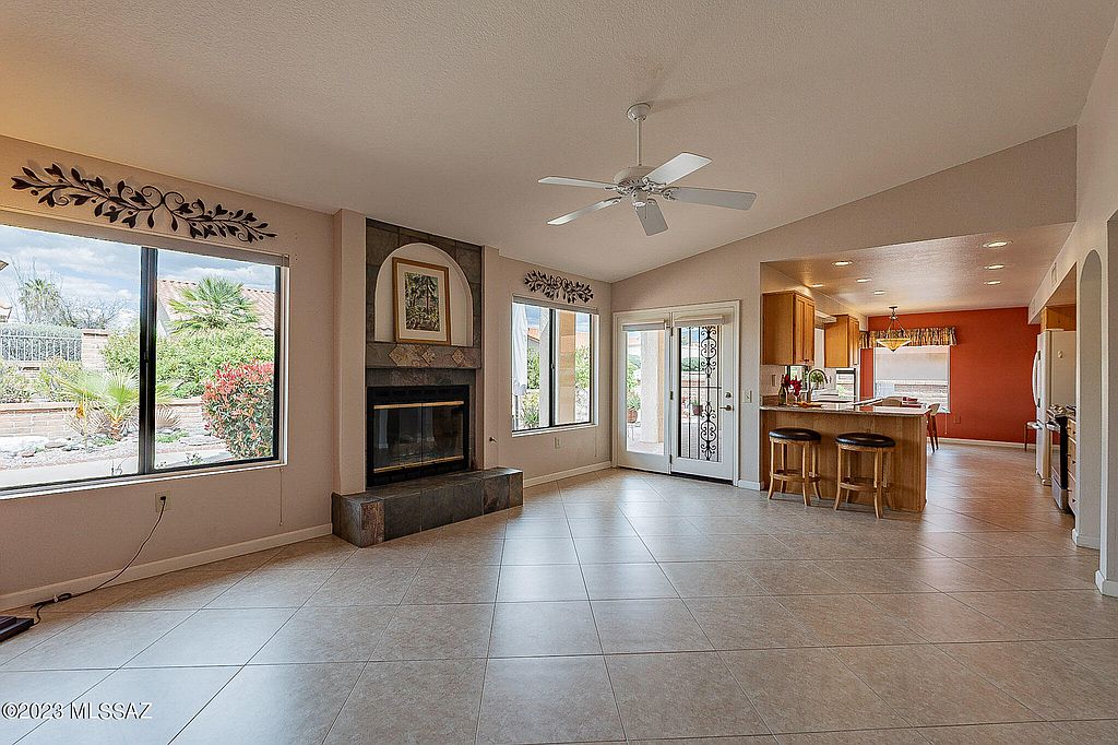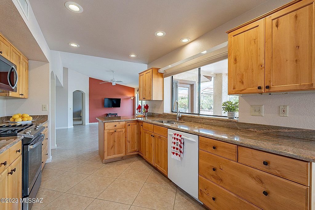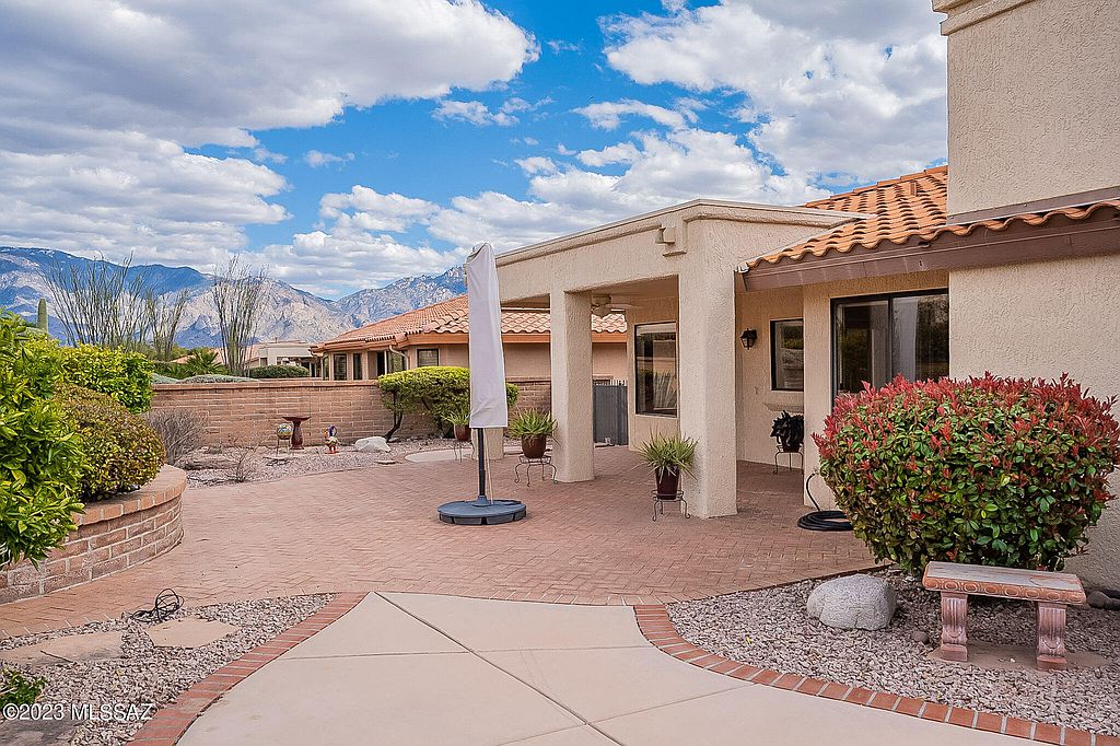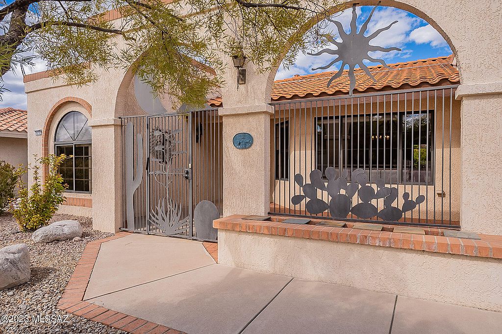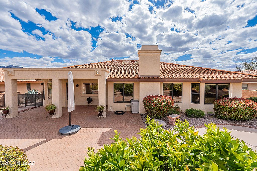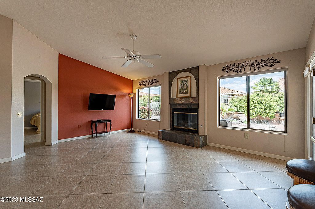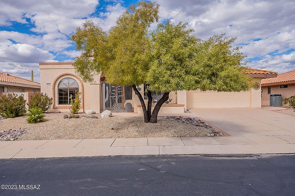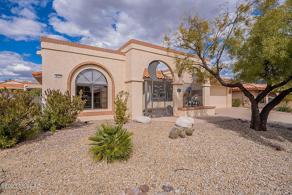 Welcome to your move-in ready Pacifica model home in Sun City Oro Valley. As you step inside this light and bright home, you'll be greeted with large, comfortable living spaces. This charming home boasts an updated kitchen complete with granite counter tops, breakfast bar, gorgeous cabinets, new gas range, and a cozy nook. The bonus room just off the kitchen is ideal for use as an office or craft room. Kitchen opens up to family room with gas fireplace and french doors to the back patio. You'll love the spacious owner's suite with its bay window and en-suite bath featuring a walk-in shower, separate tub, granite topped dual vanity, and walk-in closet. The comfortable guest room has ample space for your visitors, with an updated hallway bath conveniently located nearby. Extended garage comes with storage cabinets, washer/dryer and utility sink. Step outside to your tranquil backyard oasis complete with an expansive paver patio, lush landscaping including fruit trees, a soothing water feature, and Catalina Mountain views. You'll enjoy peace of mind with the owned solar panels. This beautiful home has everything you need to begin your active adult lifestyle today.