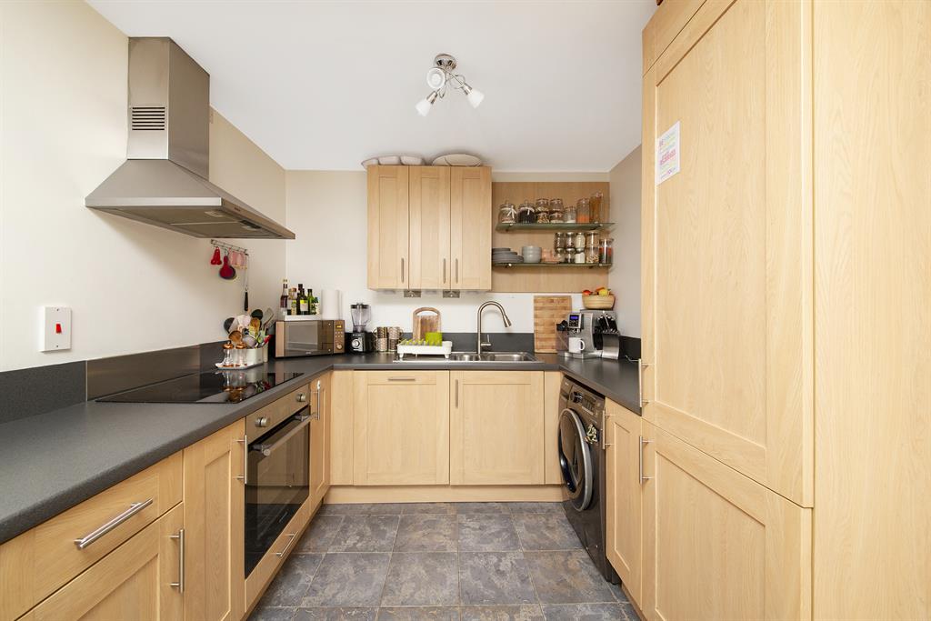 Inset one and a half bowl single drainer stainless steel sink unit with mixer tap. Range of wall cupboard units. Range of floor cupboard units. Formica work surfaces. Stainless steel built under oven and matching four hob unit with stainless steel chimney extractor hood. Integrated fridge/freezer and automatic washing machine. Matching tiled floor.