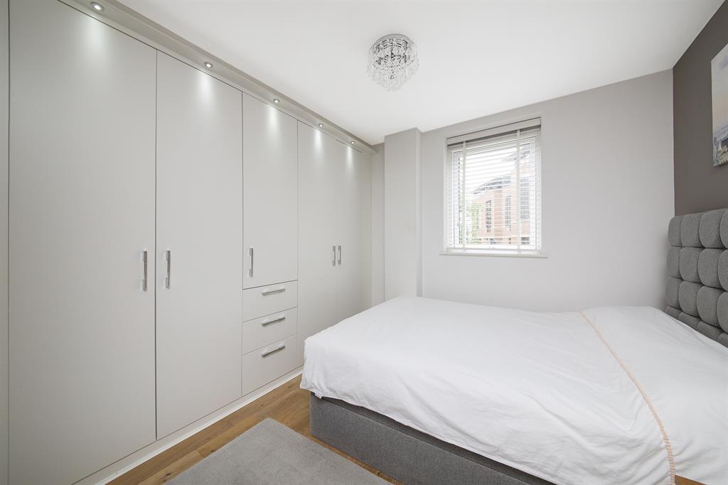 New full length range of top quality Sharps fitted furniture comprising built in double wardrobes incorporating shelved cupboards and centre drawer unit. New oak flooring. Radiator.