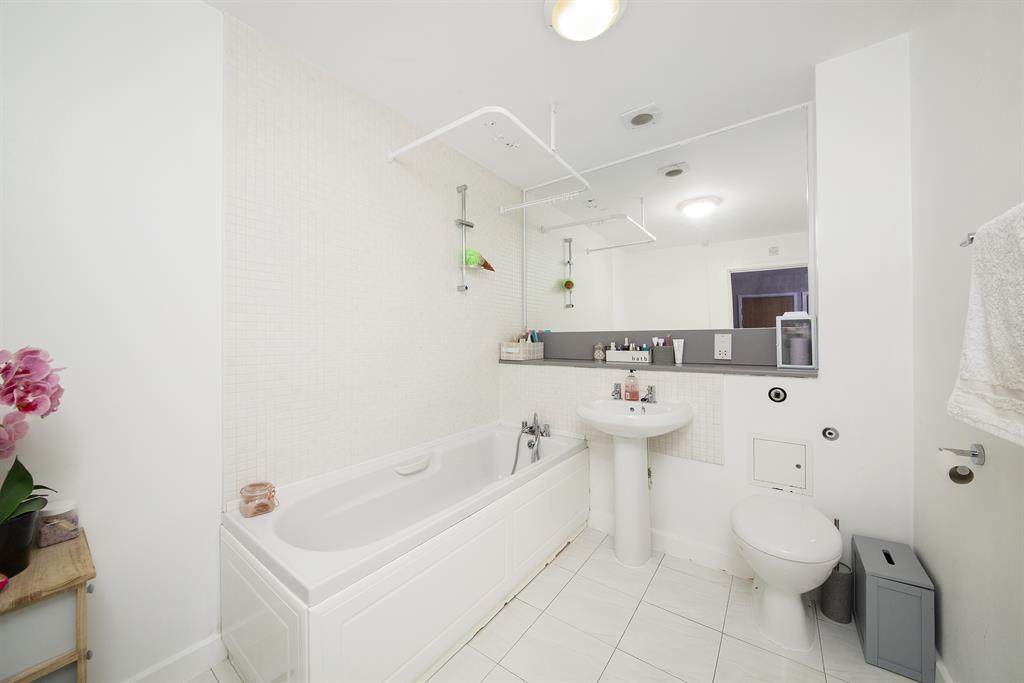 Panelled bath with mixer tap, shower over and shower rail. Pedestal wash hand basin with mixer tap. Concealed low level WC. Matching part tiled walls. Matching tiled floor. Inset display shelf with mirror. Heated towel rail.