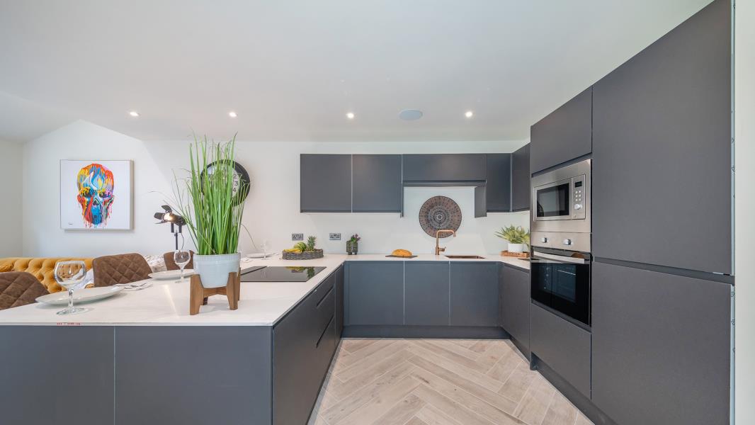 · High quality units in matt grey with soft close, handle less doors/drawers.