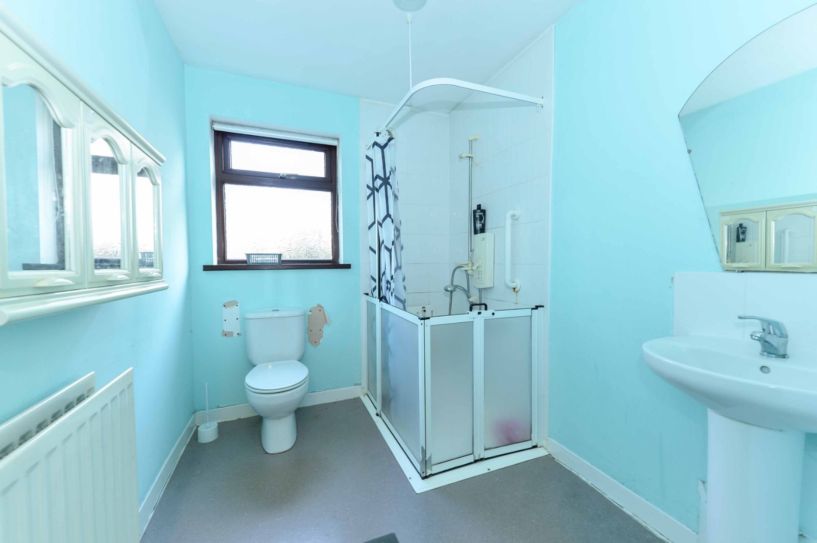 White suite, walk in shower cubicle with electric shower room, close coupled WC, pedestal wash hand basin with mixer taps and tiled splash back