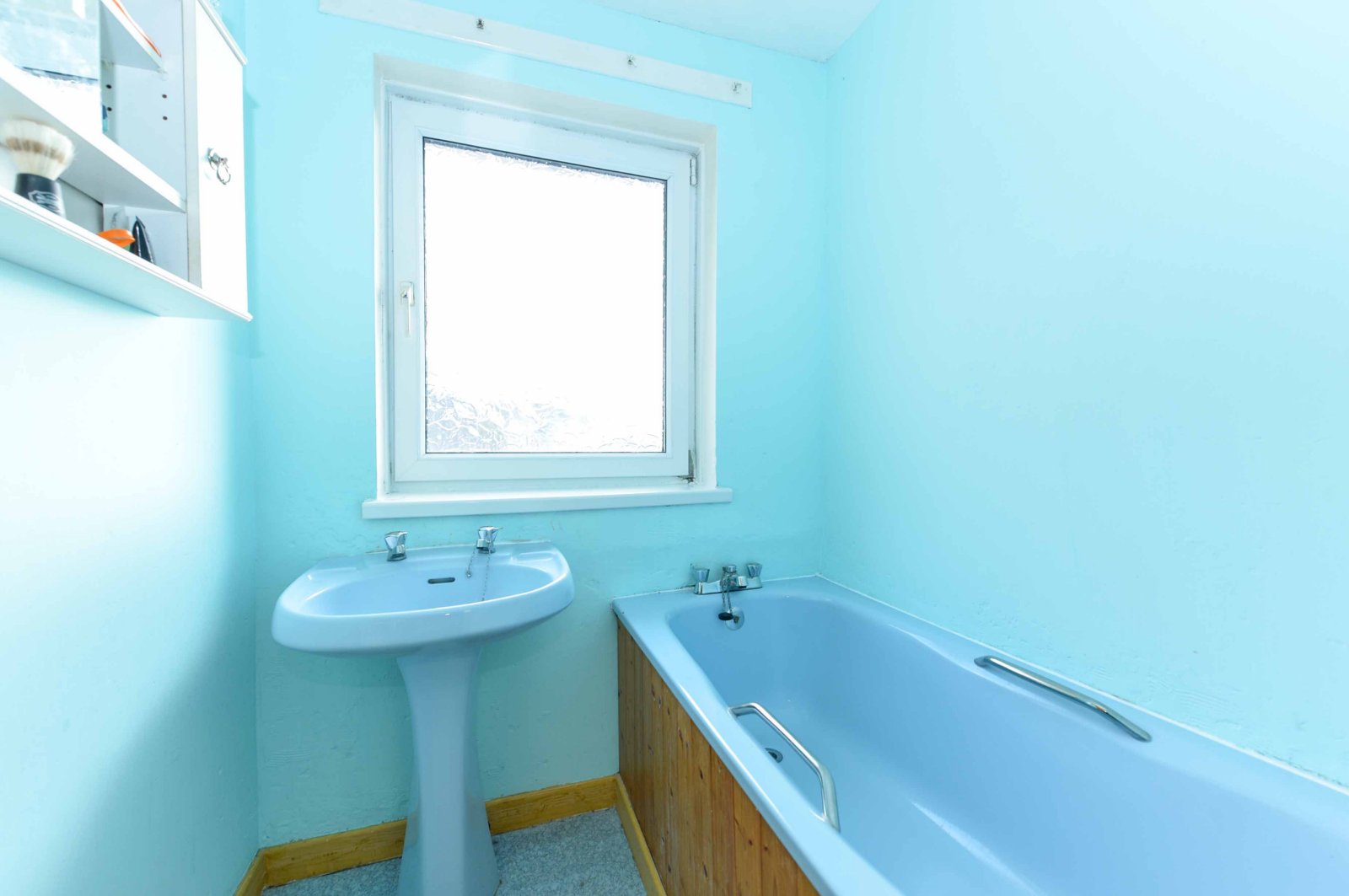 Coloured suite, panelled bath with mixer taps, pedestal wash hand basin.