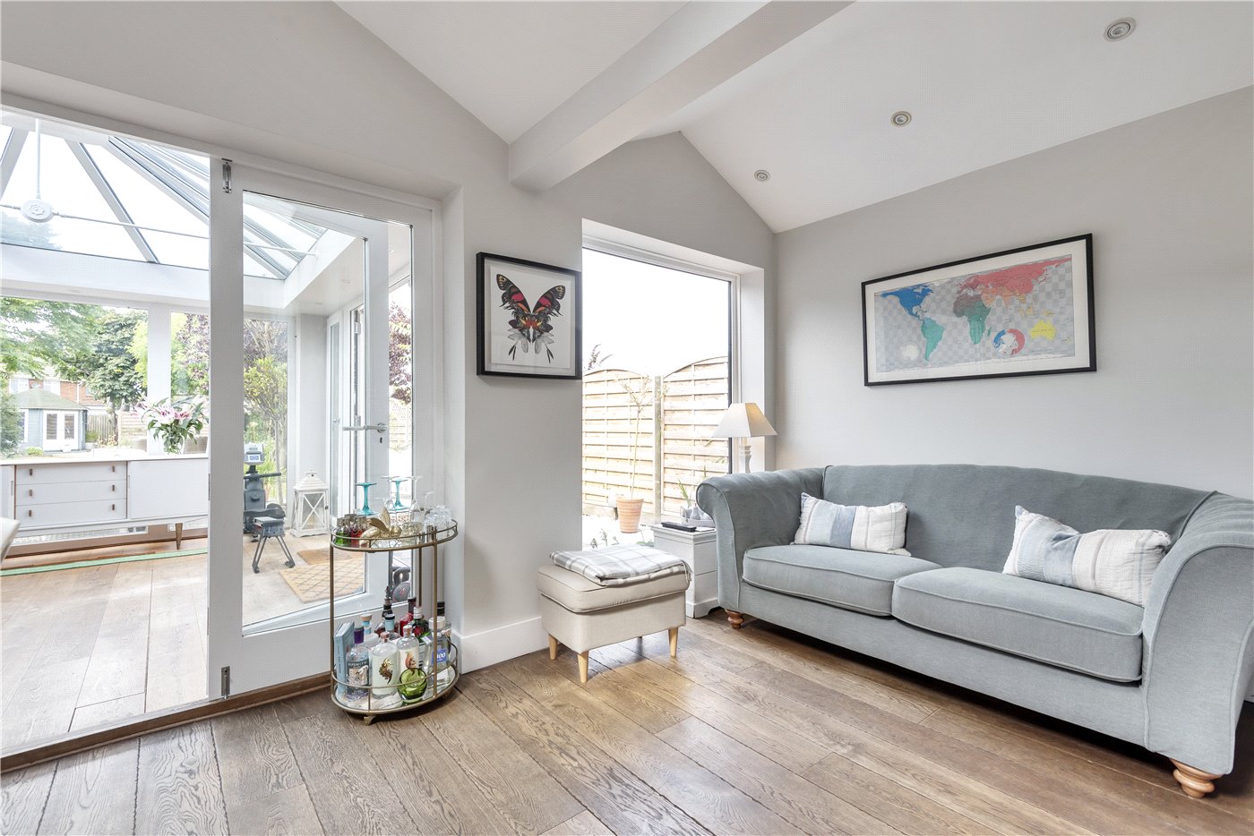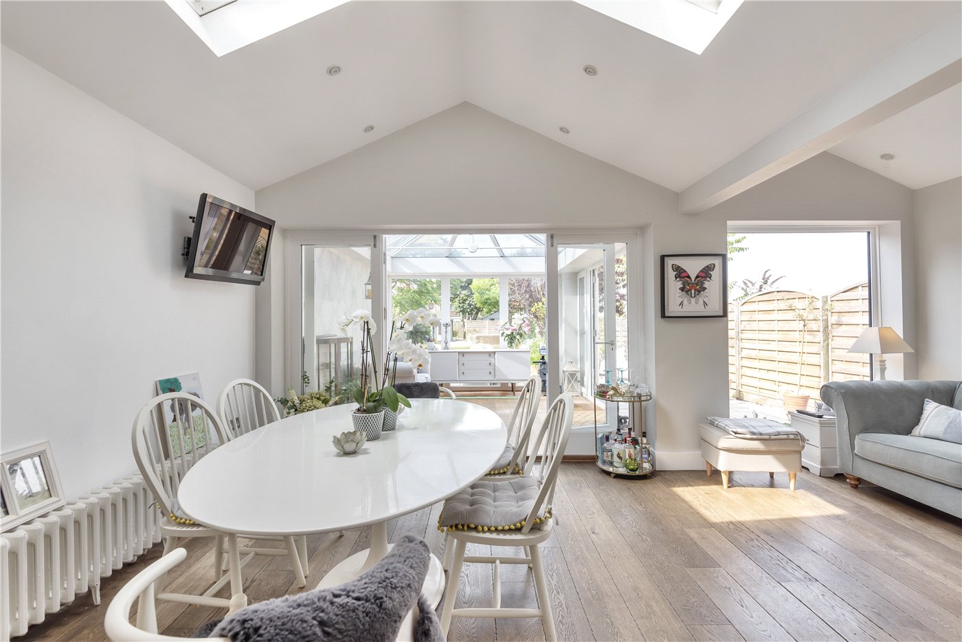 Bright modern double aspect kitchen diner leading to the modern conservatory. The kitchen is well served with white storage units containing draws and cupboards below a white polished work surface. A traditional looking double oven with gas hob and extractor unit above and a farmhouse sink with mono mixer tap and breakfast bar to the right. There is a further tall cupboard storage units to the right of the room with space for a large refrigerator and doorway leading to the utility and downstairs toilet. The dining room area is spacious and provides for a lifestyle room with orangery window above and low level traditional style radiator with TV points and electrical points throughout. It leads to a modern and spacious double aspect conservatory with an easterly doorway leading to the patio with space for entertaining and garden.