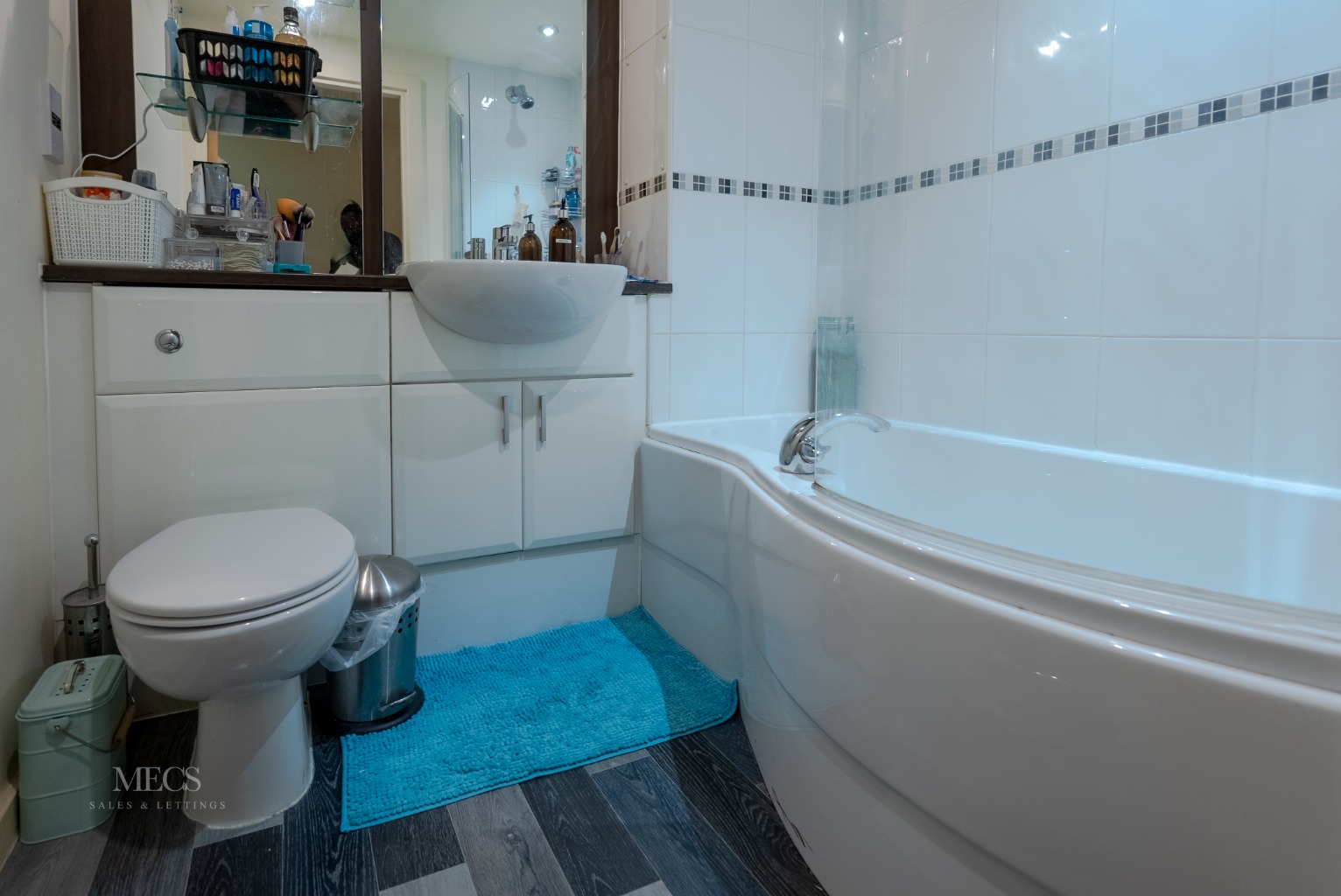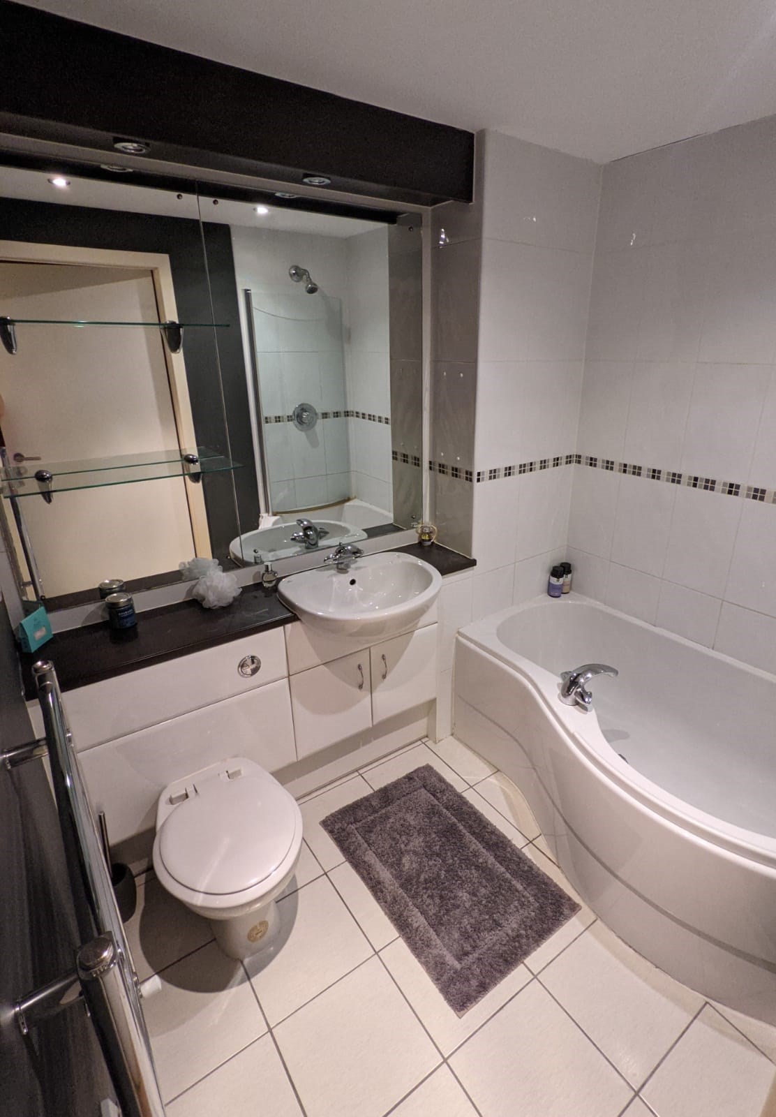 Bathroom - Modern suite comprising a vanity unit fitted with the push-button WC and wash hand basin with a mirror, glass shelves and overhead spotlights, and a curved bath with an overhead shower and glass screen. Tiled walls and flooring and a chrome heated towel rail.