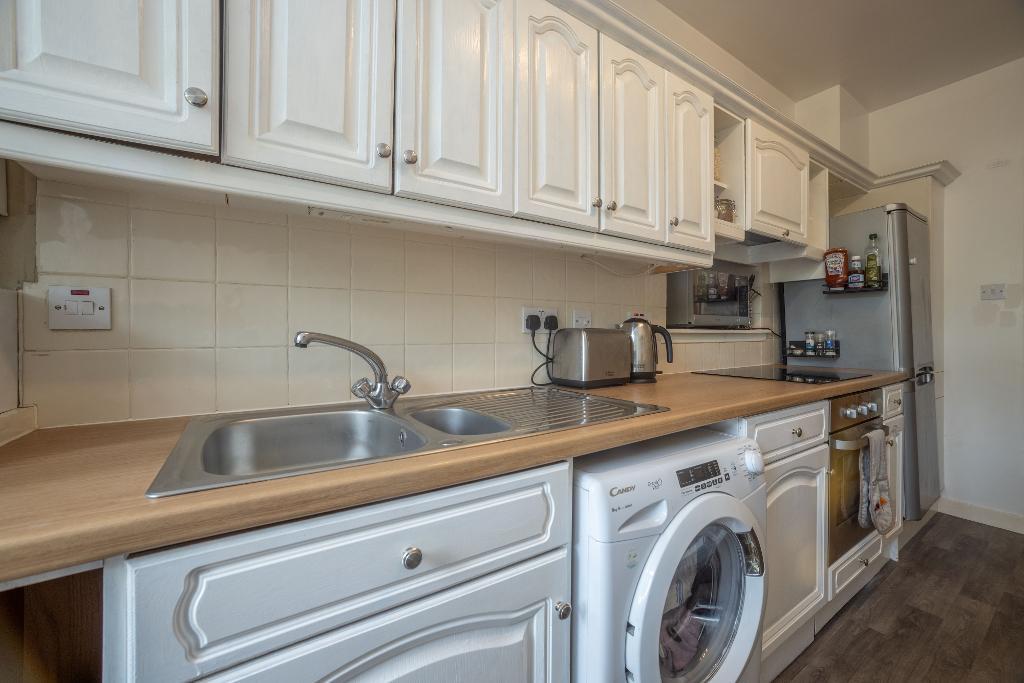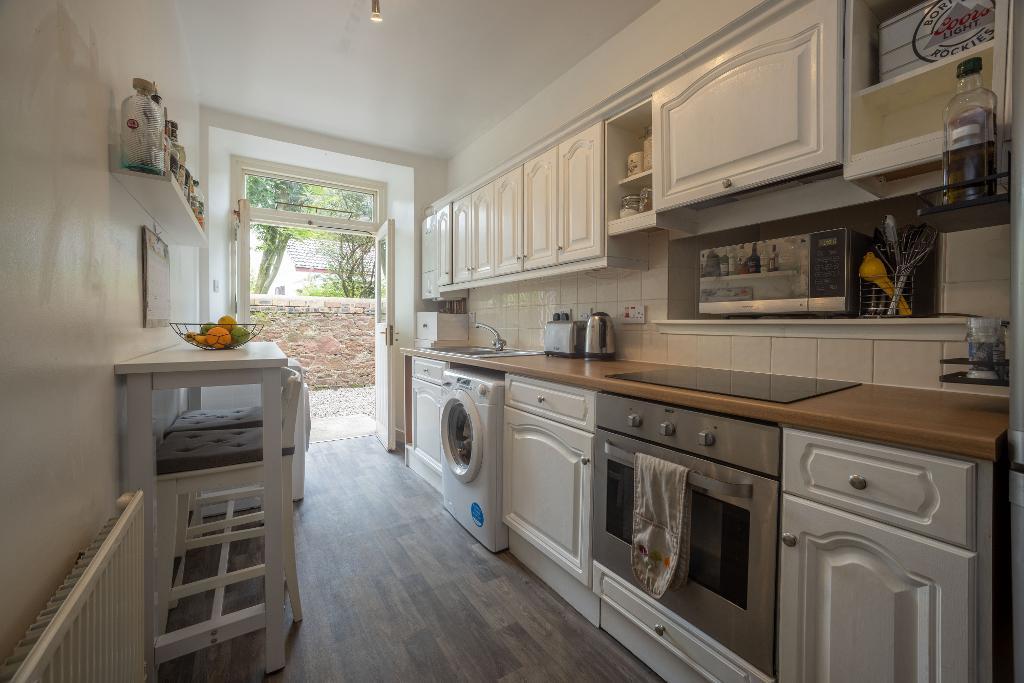 Fitted kitchen with wall and base mounted units, splash back tiling, sink unit and drainer. Free standing fridge freezer, Induction electric hob, electric oven and extractor. Space and plumbing for washing machine. Alcove display area. Attractive linoleum flooring. Double doors provide access into rear garden.
