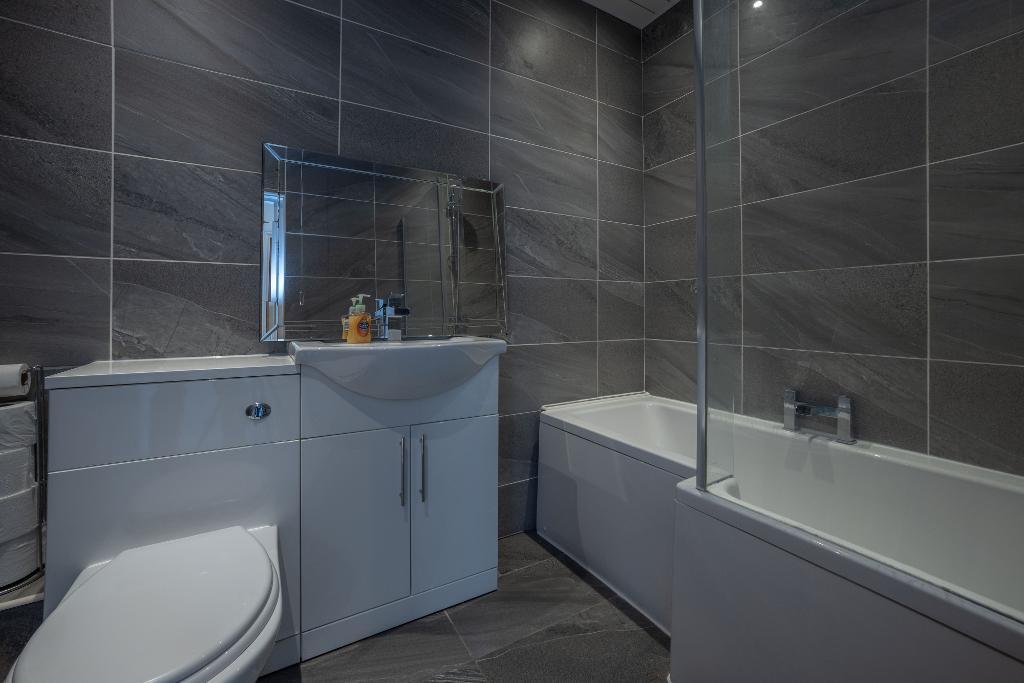 Tastefully decorated bathroom with attractive tiling to walls and floor. The bathroom includes a wc and wash hand basin within a combination unit, P shaped bath with shower screen and shower above. Towel rail radiator. Spotlights to ceiling.